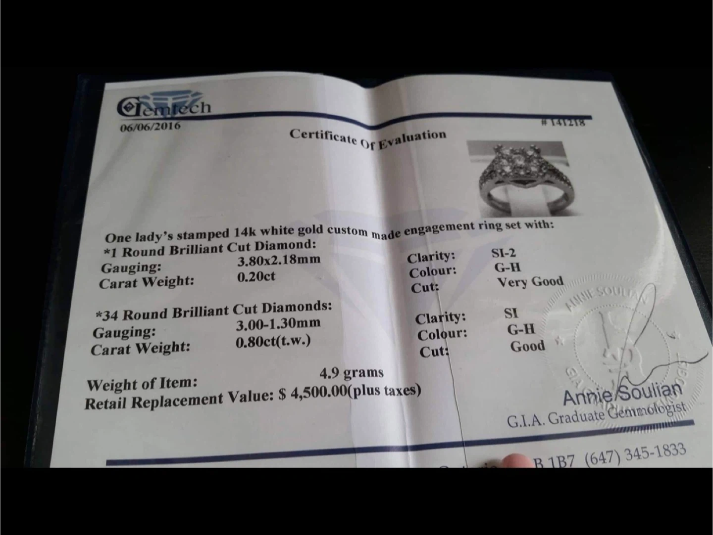 The ring weighs 4.9 grams. According to the certificate of evaluation, the retail replacement value is $4,500.00 (plus taxes)
