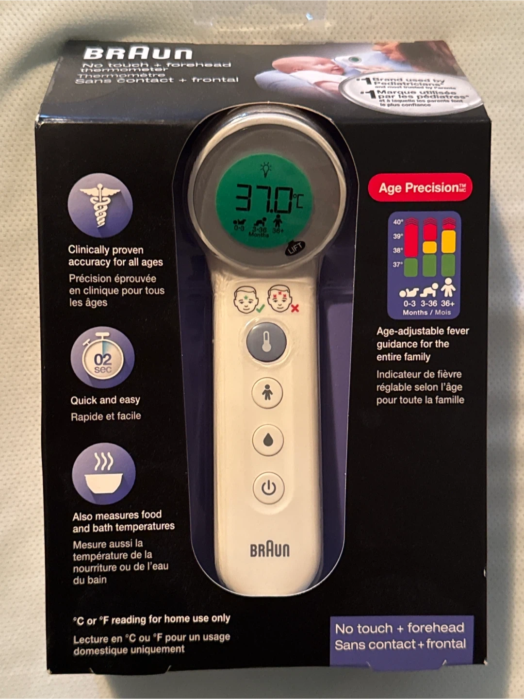 Selling a brand new Braun No Touch + Forehead Thermometer! It's still in its original packaging. This thermometer is clinically proven for all ages and provides quick and easy temperature readings in just 2 seconds. It can also measure food and bath temperatures. The Age Precision feature provides age-adjustable fever guidance for the entire family. Get accurate readings without any contact!