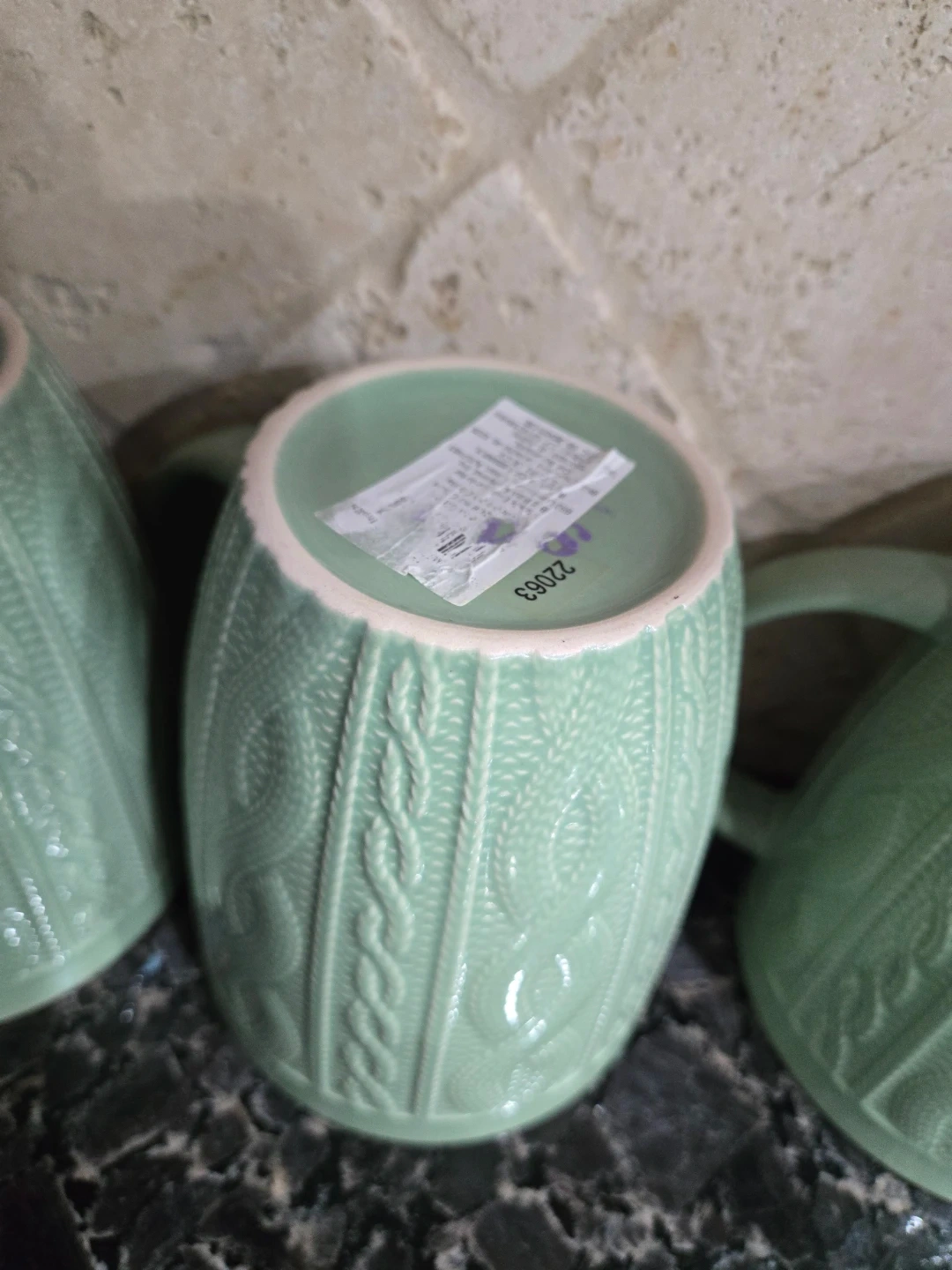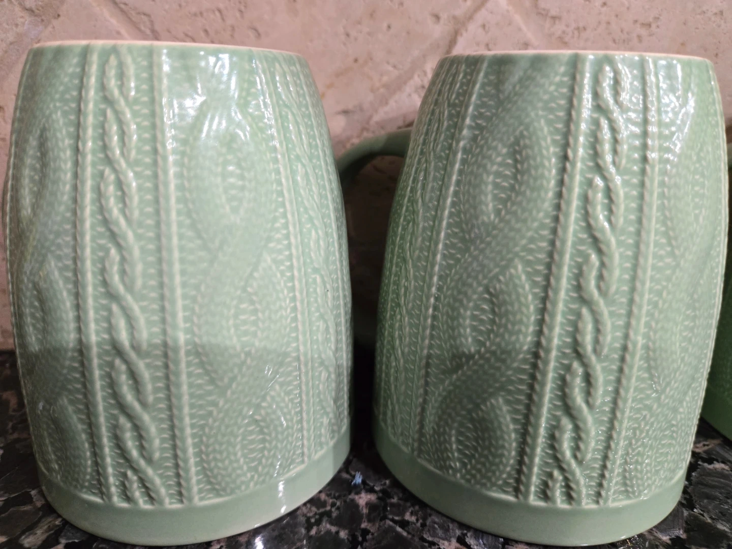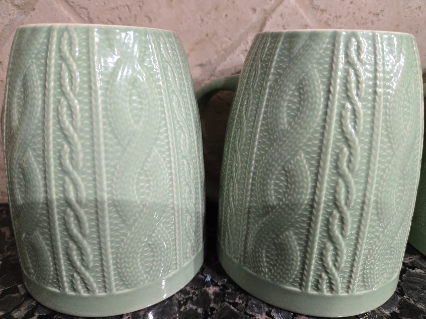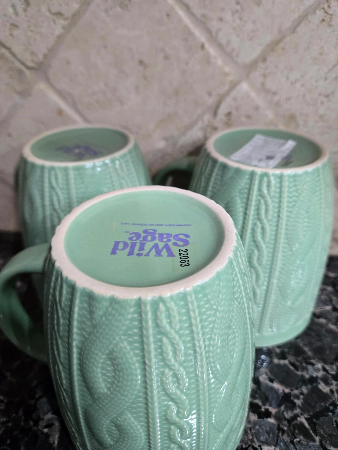 Here's a set of six Wild Sage mugs in a lovely green colour! They feature a unique knit design that adds a cozy touch to your morning coffee or tea. Perfect for adding a bit of style to your kitchen!