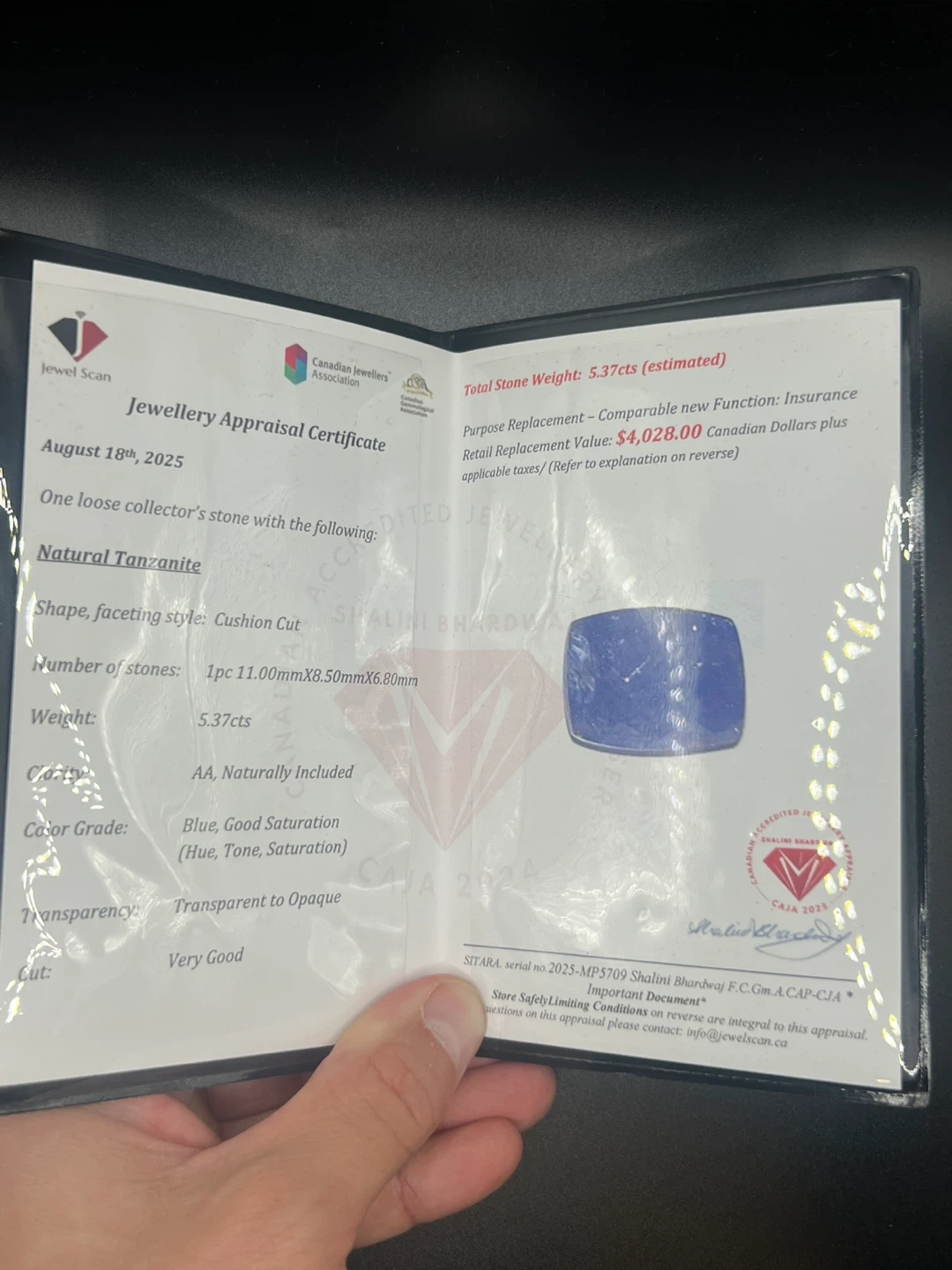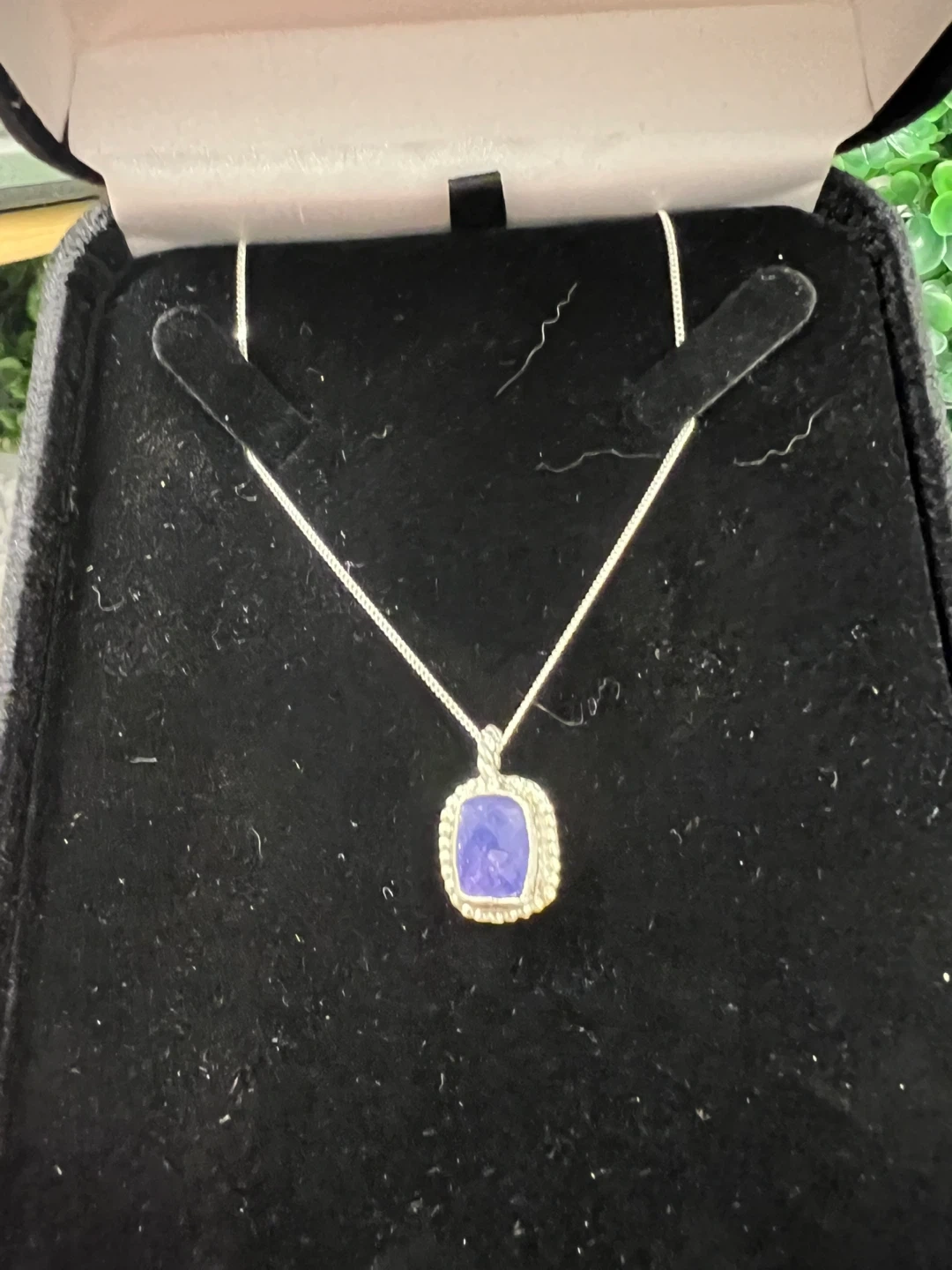 Beautiful Tanzanite necklace! The stone is a natural tanzanite with a cushion cut. It's set in silver. The stone weighs 5.37 carats and the color grade is blue. The transparency is transparent to opaque and the cut is very good. Comes with a jewellery appraisal certificate from August 18th, 2025.