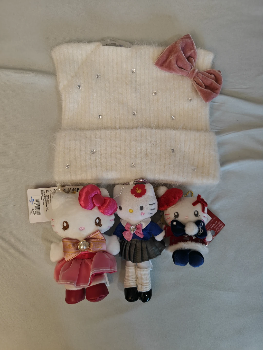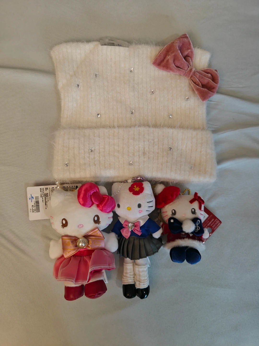 Selling a collection of Hello Kitty items! Included are three adorable plush charms, each with unique outfits and details. Also included is a soft, fuzzy white hat with a pink bow and sparkly accents. Perfect for any Hello Kitty fan!