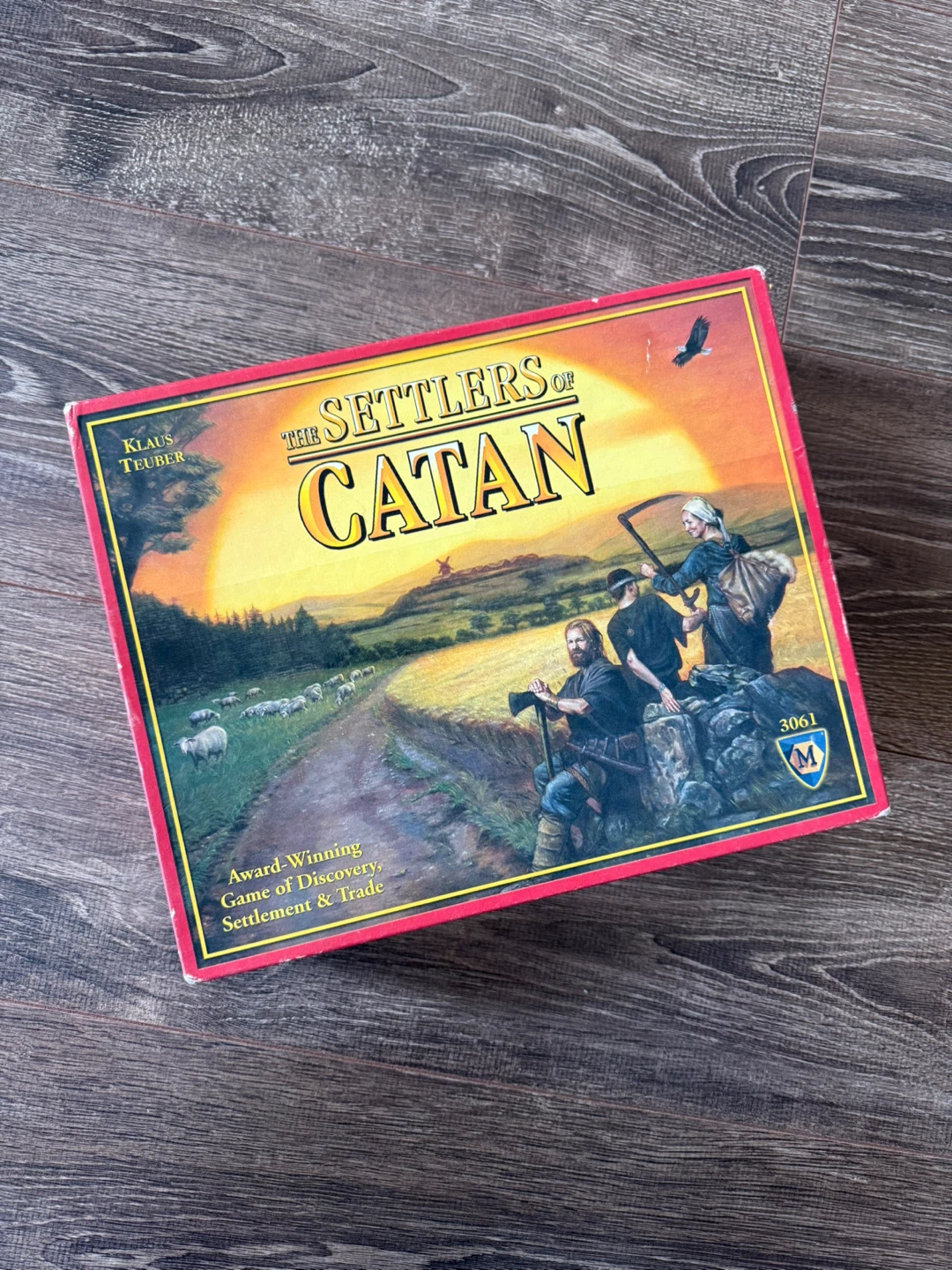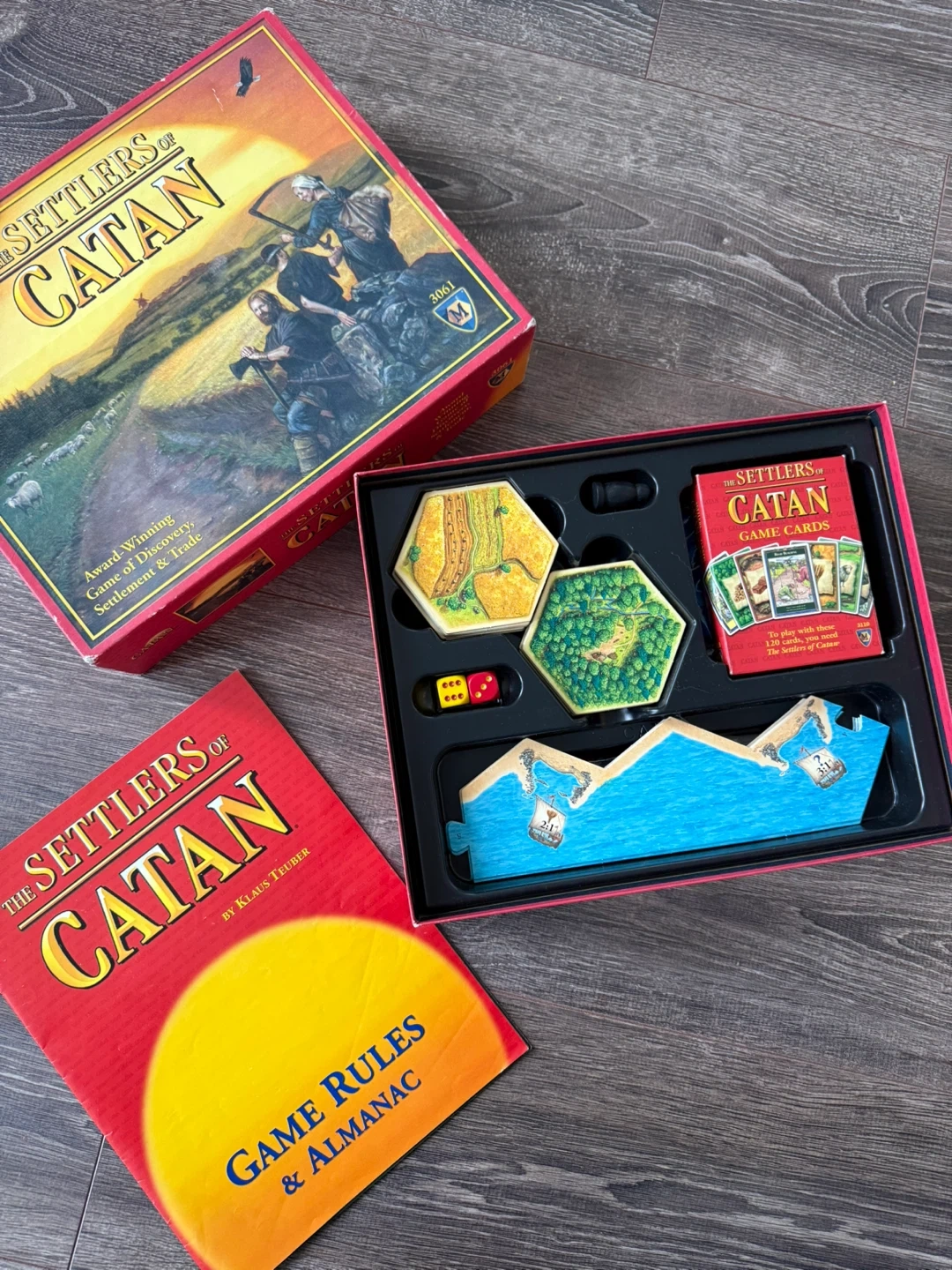 Selling a complete Settlers of Catan board game! It's an award-winning game of discovery, settlement, and trade. Includes the game board, cards, dice, and game rules almanac. Hours of fun for the whole family!