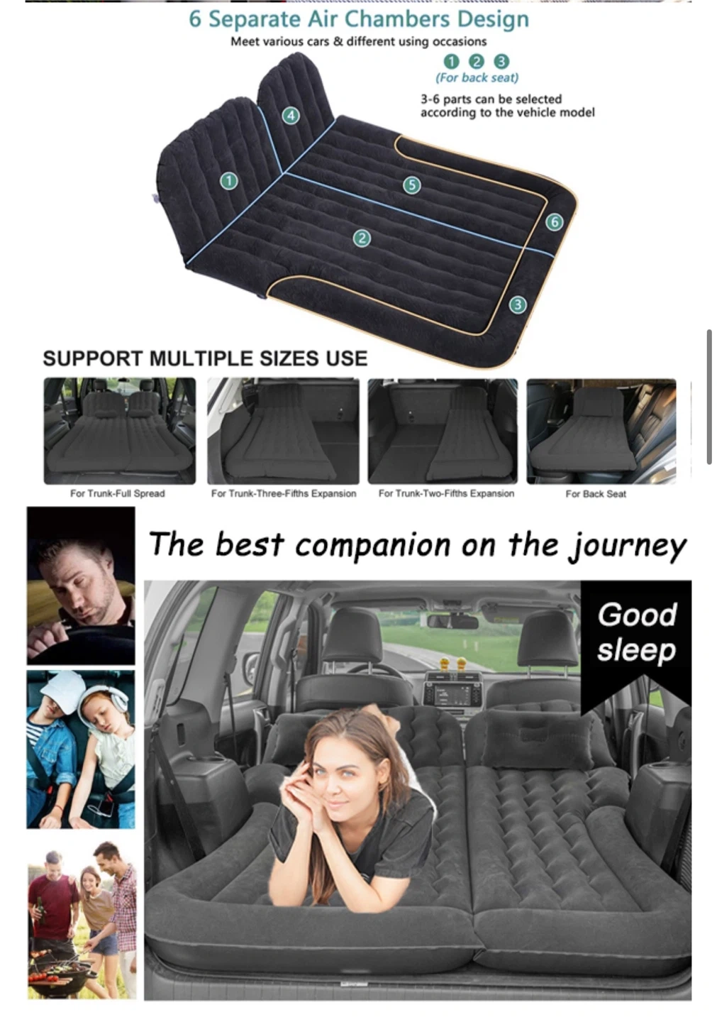 Tlingsd SUV air mattress design features 6 air chambers with 2 pillows that can be configured to fit most SUVs, minivans, sedans, and trucks. It offers a single or double bed option, making it perfect for solo adventurers or couples on the road. With a size of 68.5 inches * 49.6 inches, it provides ample space for a comfortable night's sleep.