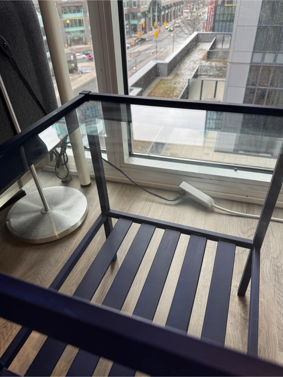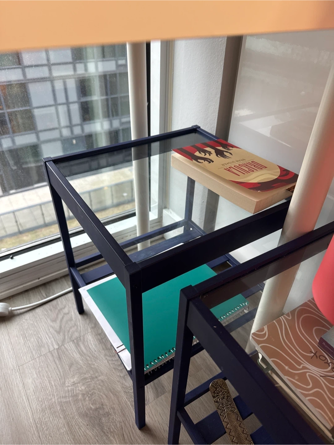 2x Blue Side Tables. It's in great shape. Made of wood and glass top. Perfect for small spaces and easy to move around. Very light also. $8 each!