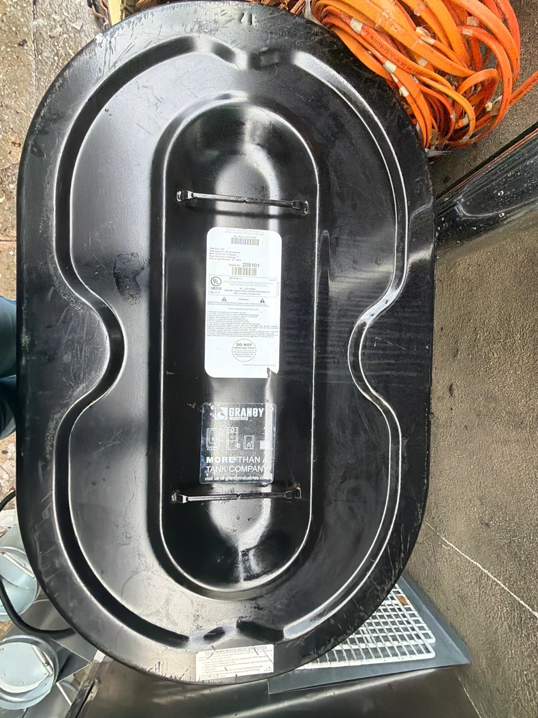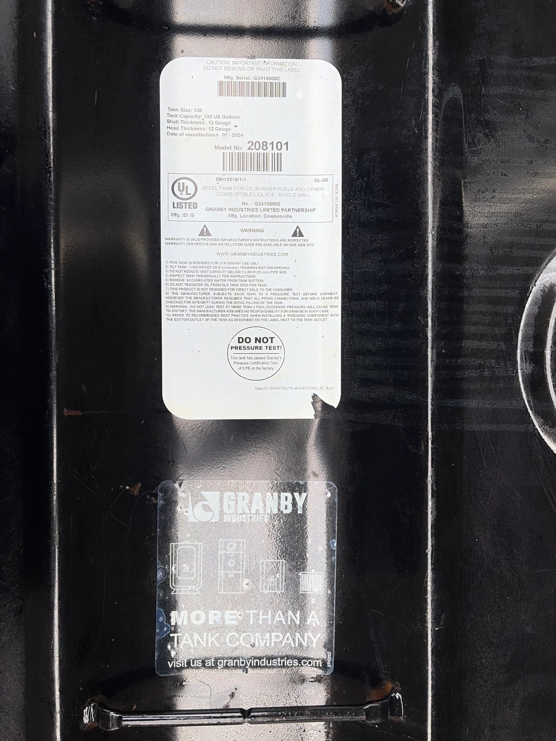 Selling a Granby tank with a capacity of 182 US gallons. It is a steel tank for oil/burner fuels and other compatible liquids. The tank thickness is 12 gauge. Feel free to reach out if you're interested!