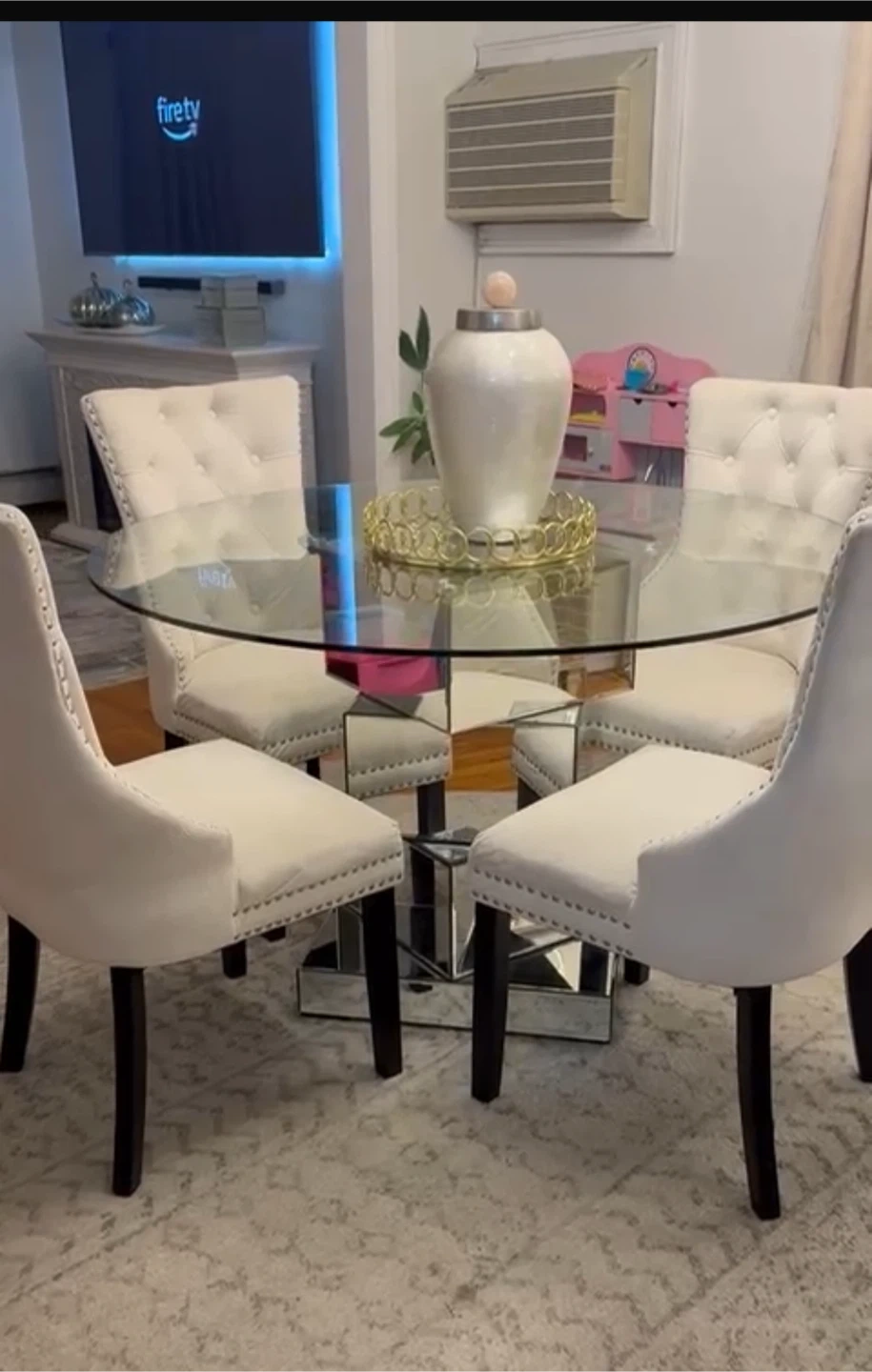 Selling a glass top dining table with four chairs. The chairs are upholstered in a light cream color with nailhead trim, and the table has a mirrored base. Perfect for a dining room or eat-in kitchen!