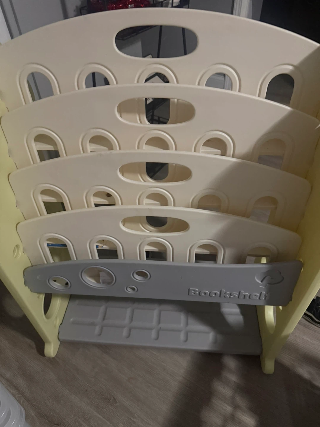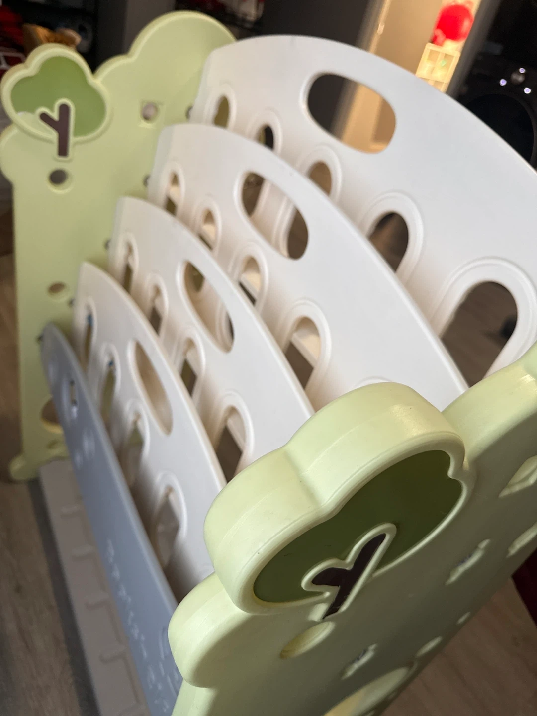 Selling a cute bookshelf for kids! It's a great way to organize their favorite stories. The bookshelf is a cheerful pastel green color with gray accents. It has multiple tiers for easy access and display