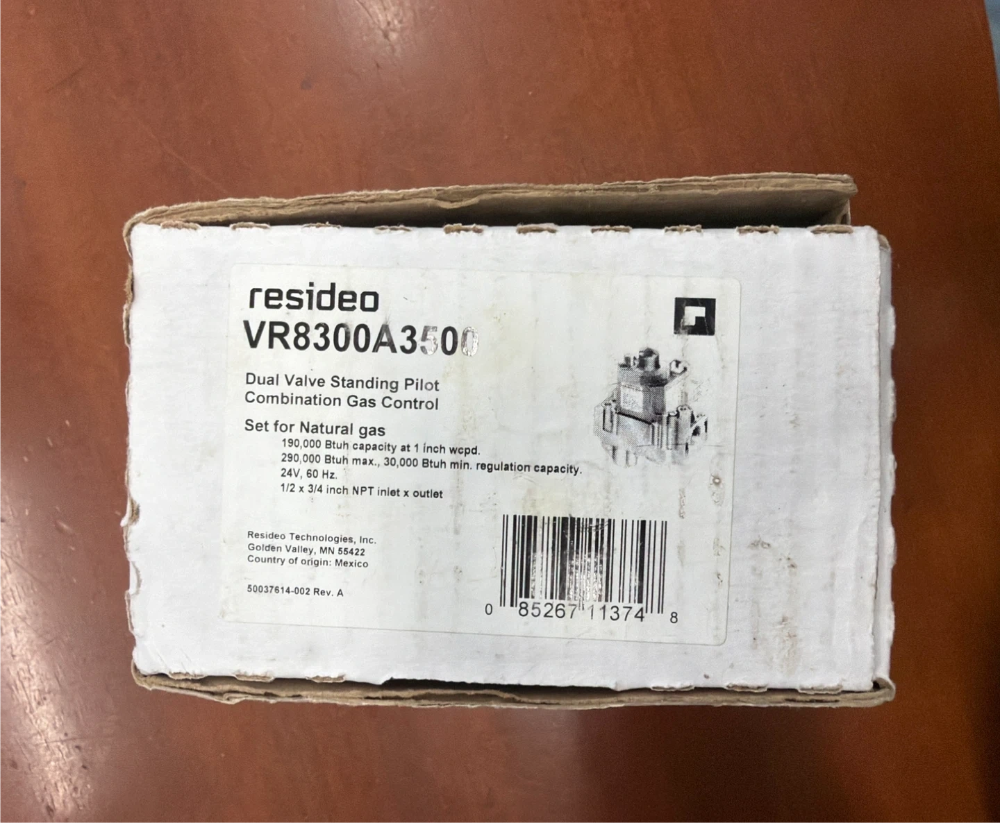 Selling a Resideo VR8300A3500 dual valve standing pilot combination gas control. It's set for natural gas and has a 190,000 Btuh capacity at 1 inch wcpd, with a 290,000 Btuh max and 30,000 Btuh min regulation capacity. Operates at 24V, 60 Hz, with a 1/2 x 3/4 inch NPT inlet x outlet. Includes 3/4 to 1/2 inch straight bushing, natural to LP gas conversion kit, and pilot compression fitting for 1/4 inch O.D. tubing. Comes in its original box