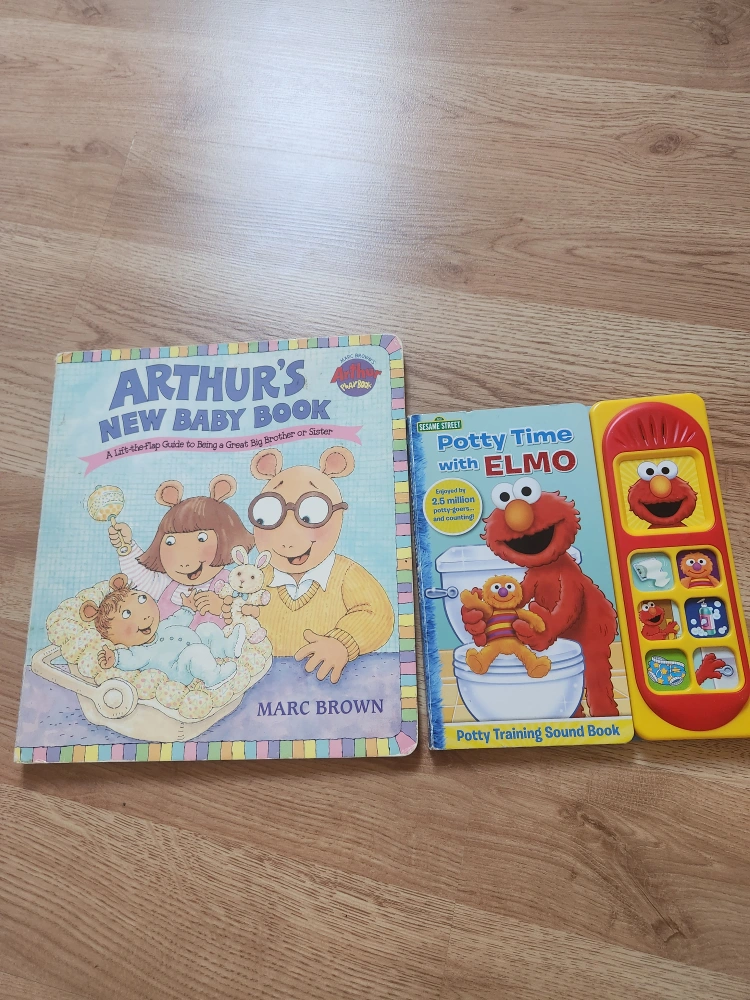 Selling two children's books in great condition! One is "Arthur's New Baby Book" by Marc Brown. The other is a Sesame Street "Potty Time with Elmo" potty training sound book!