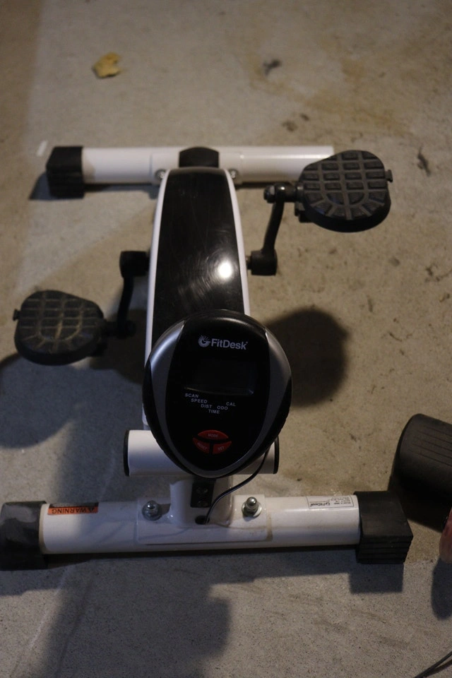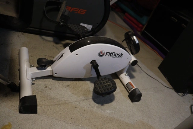 Lightly used FitDesk Under Desk Cycle — perfect for staying active while working, gaming, or watching TV. Smooth pedaling, adjustable resistance, built-in display for speed, distance, time, and calories. Clean and fully functional, just some cosmetic wear on the pedals. Great for students, home offices, or physiotherapy. Pickup