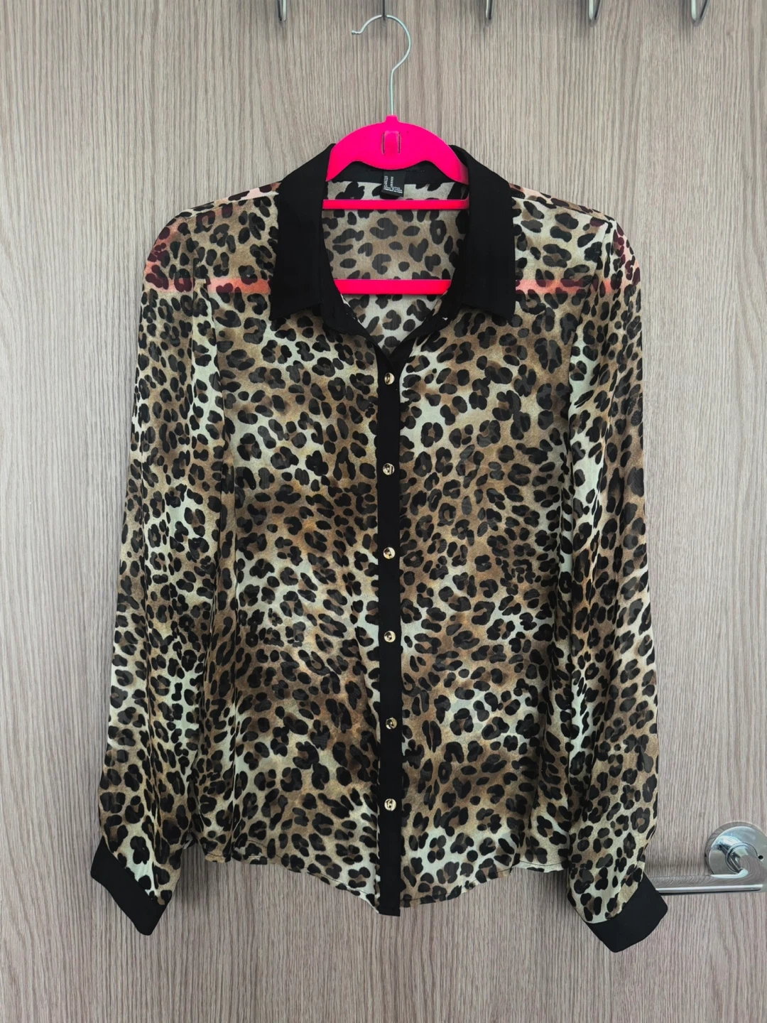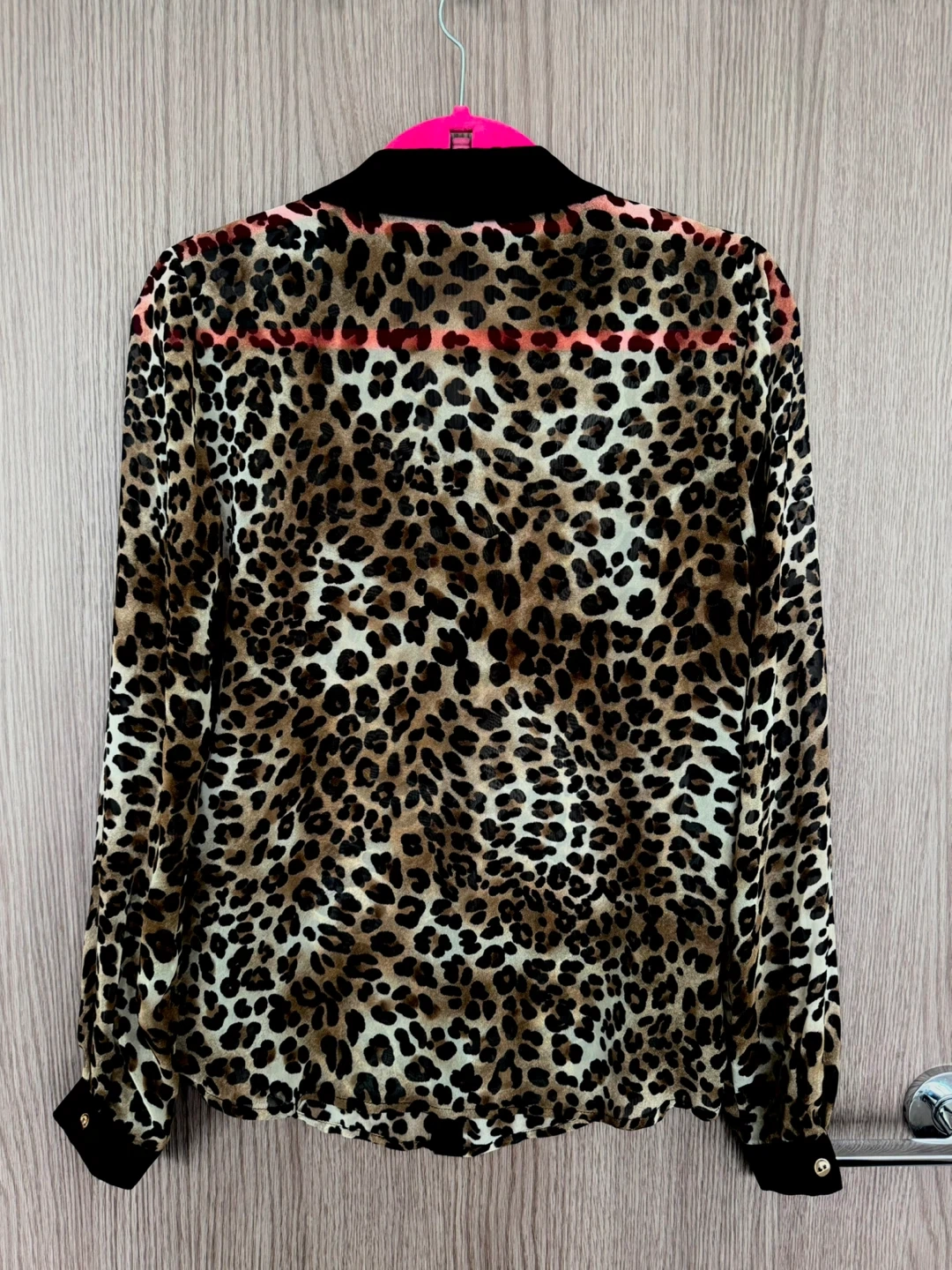 • Leopard print with black collar, placket & cuffs