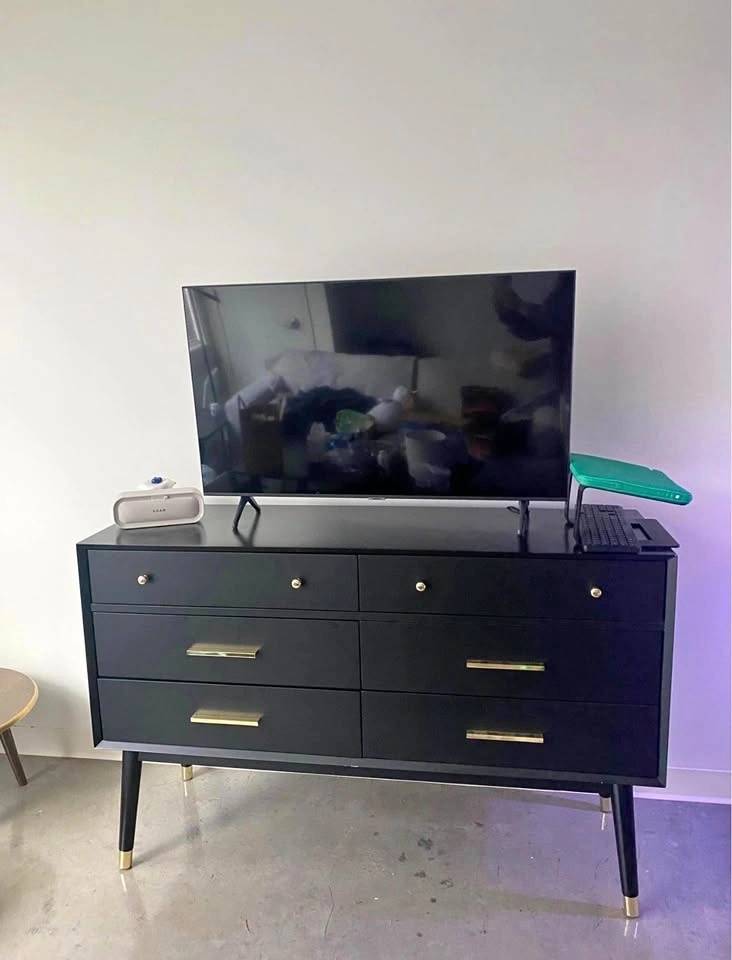 Black dresser with elegant gold details, ideal to give a modern and sophisticated touch to any space.