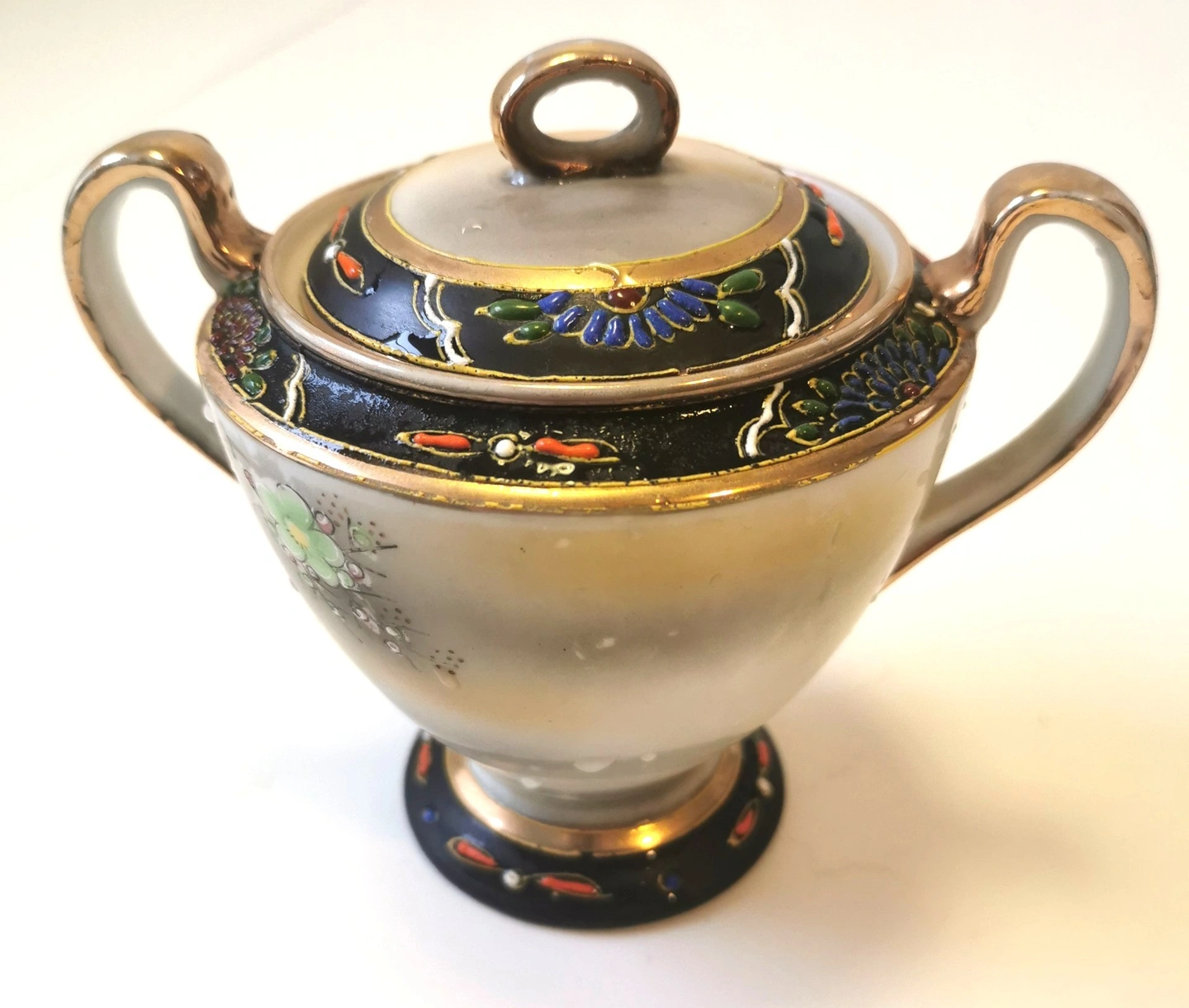 Sugar Bowl & Creamer: Both are in excellent vintage condition light wear. The colors are bright, and the gold trim shows only very minor shelf wear consistent with age.