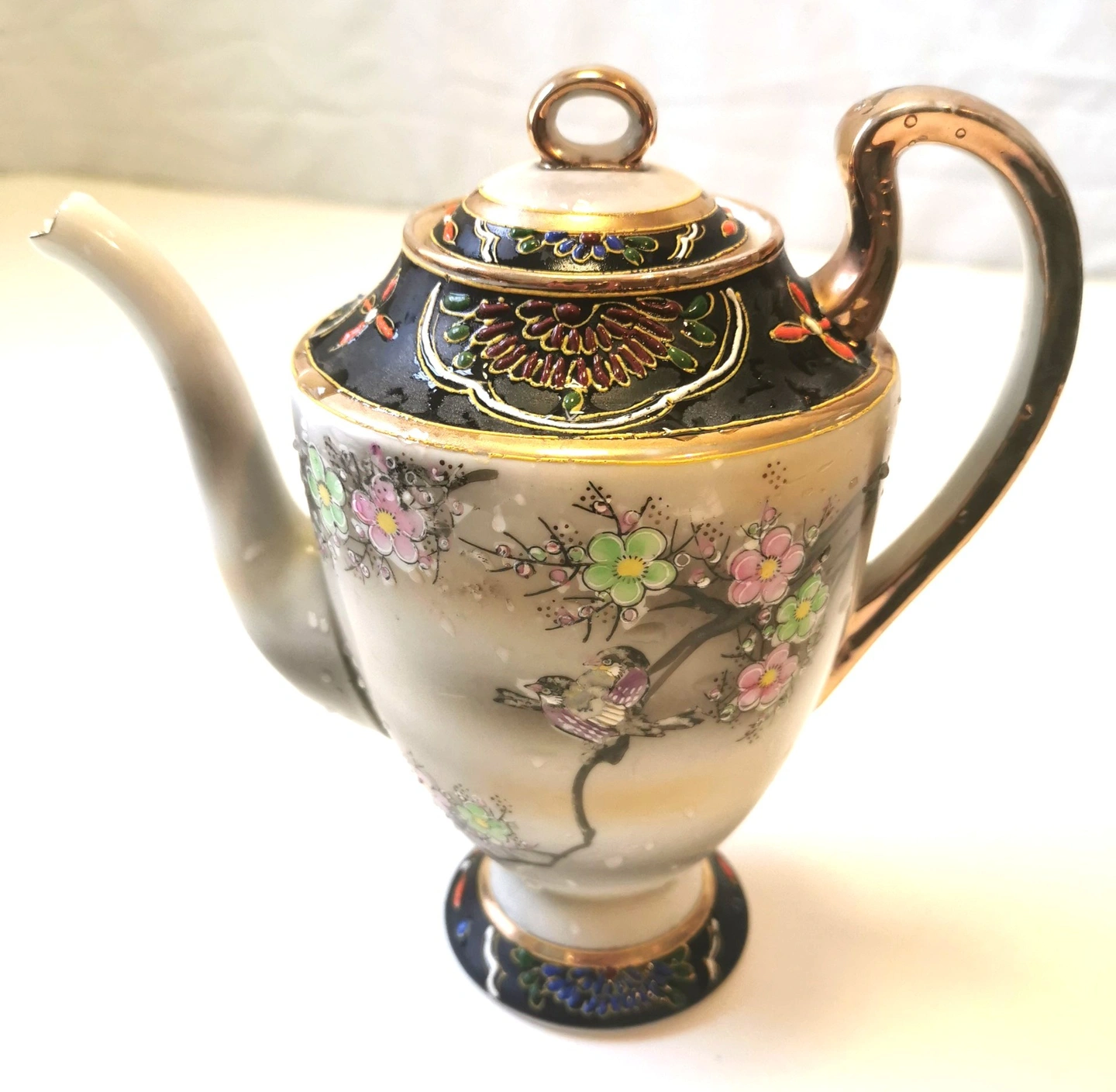 Stunning mid-century (c. 1950s) porcelain tea set by Mikori, Japan. This set features vibrant, hand-painted floral designs and heavy Moriage (raised enamel) detailing that gives it a beautiful 3D texture. The gold gilt accents add a high-end vintage feel that looks incredible on a hutch or display shelf.