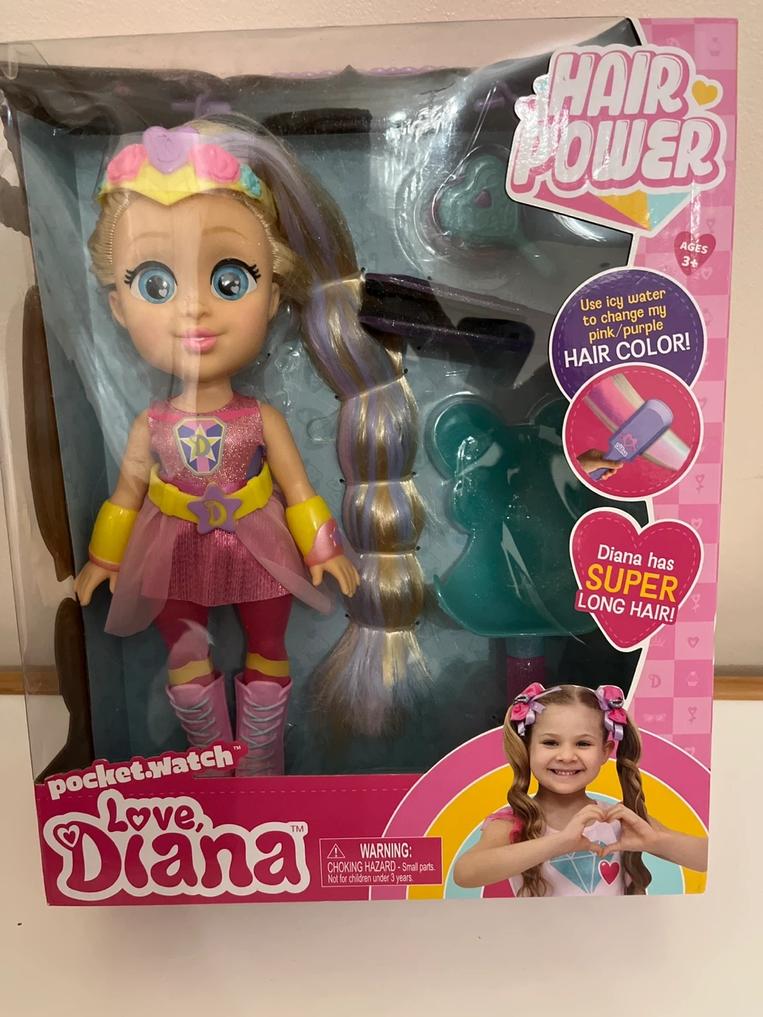 Selling a brand new Love Diana Hair Power doll still in its original packaging! This cute doll has super long hair and is ready for fun adventures. Use icy water to change my pink/purple hair color! Recommended for ages 3+ bit damage top corner nothing big