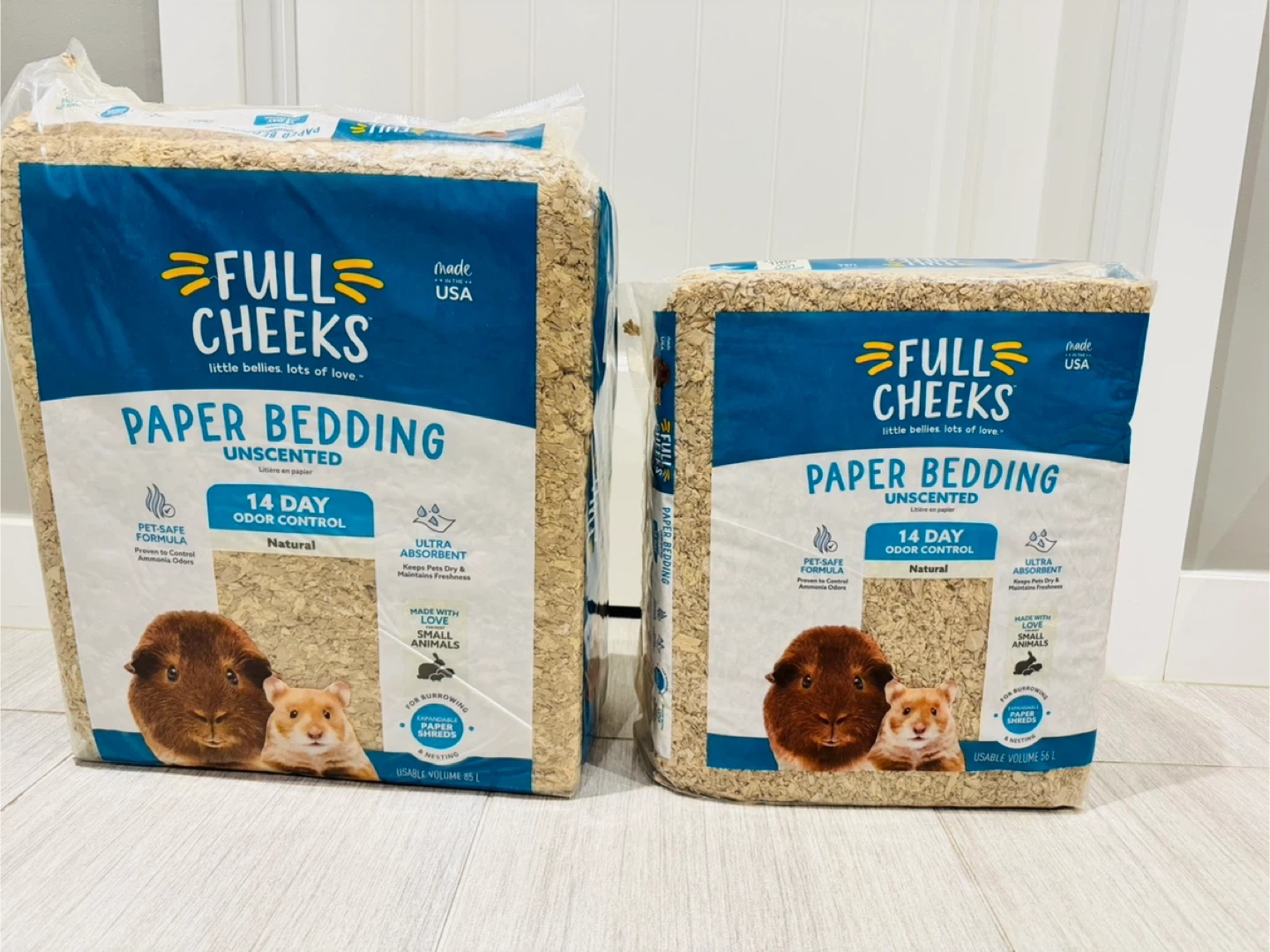 Two bags of Full Cheeks Unscented Paper Bedding, perfect for guinea pigs, rabbits, hamsters, and other small animals.