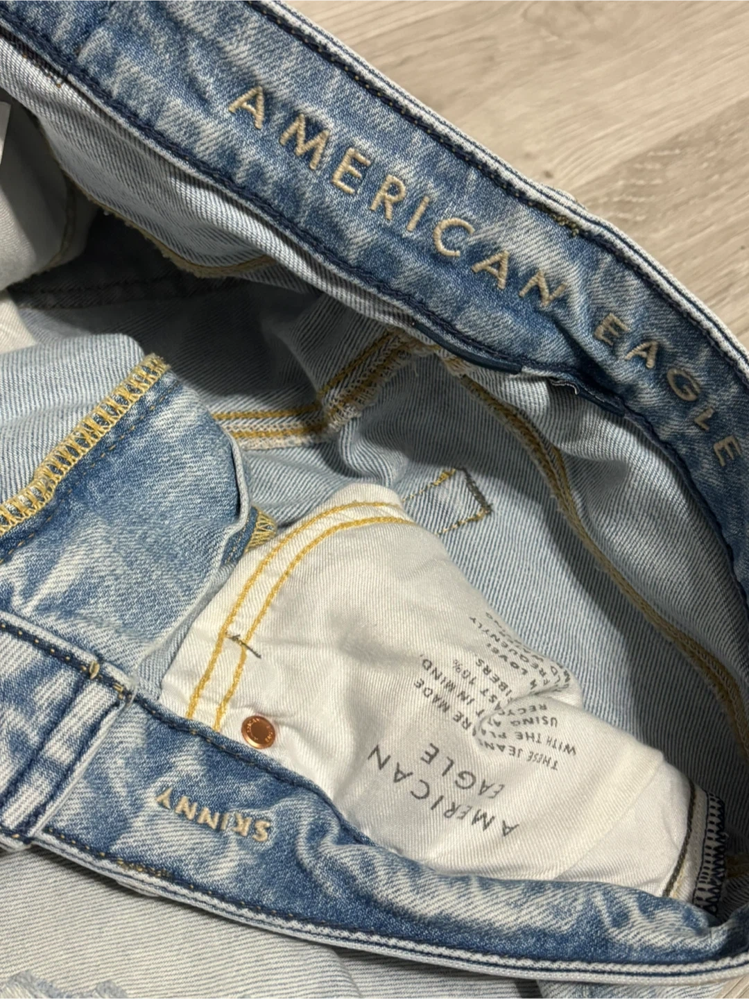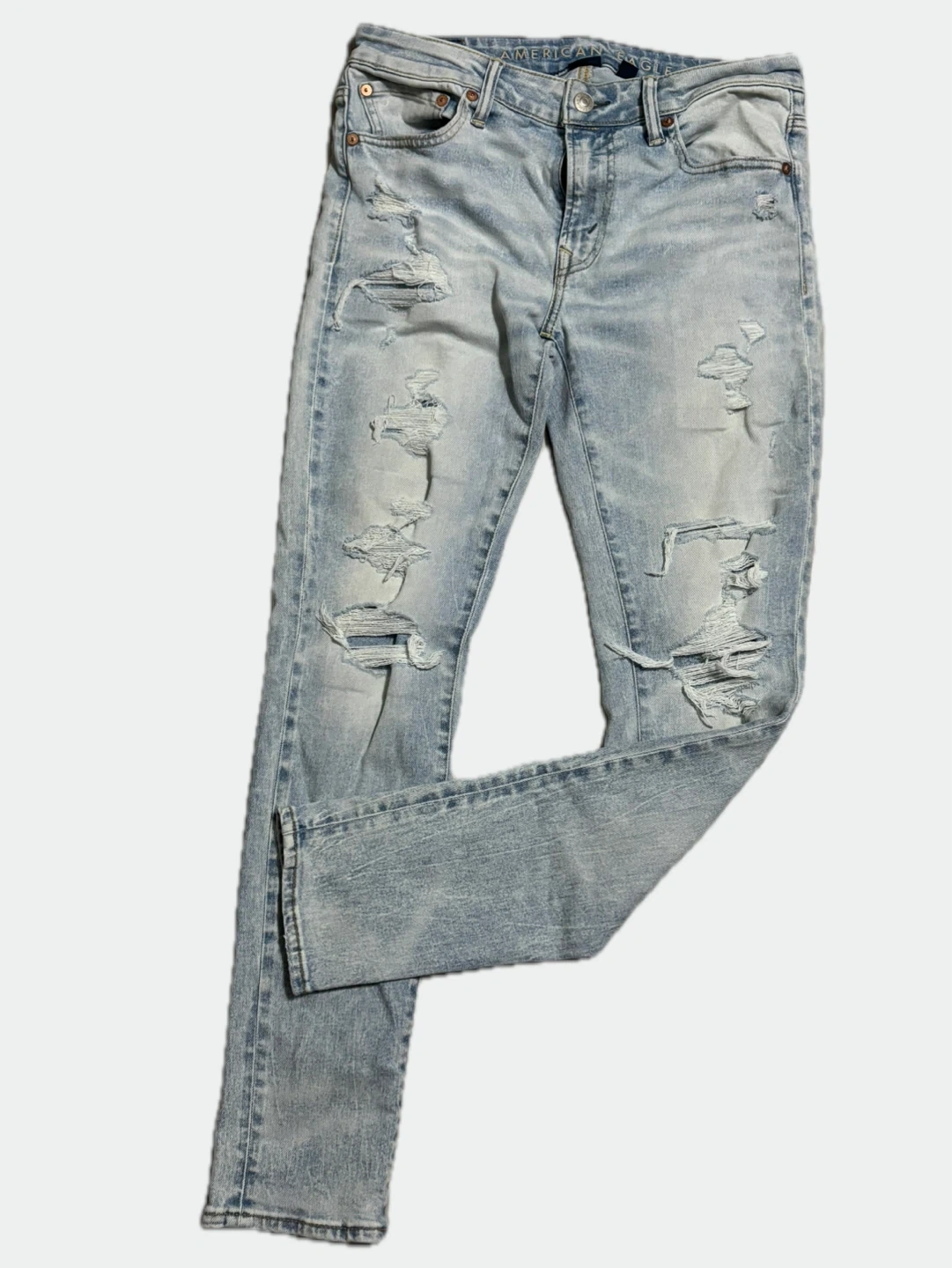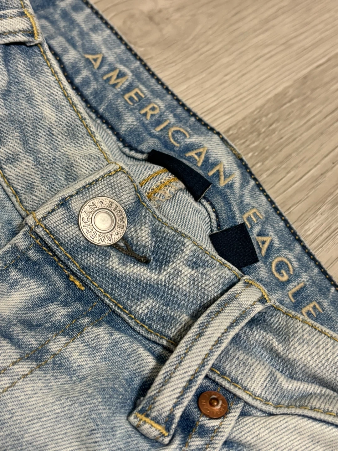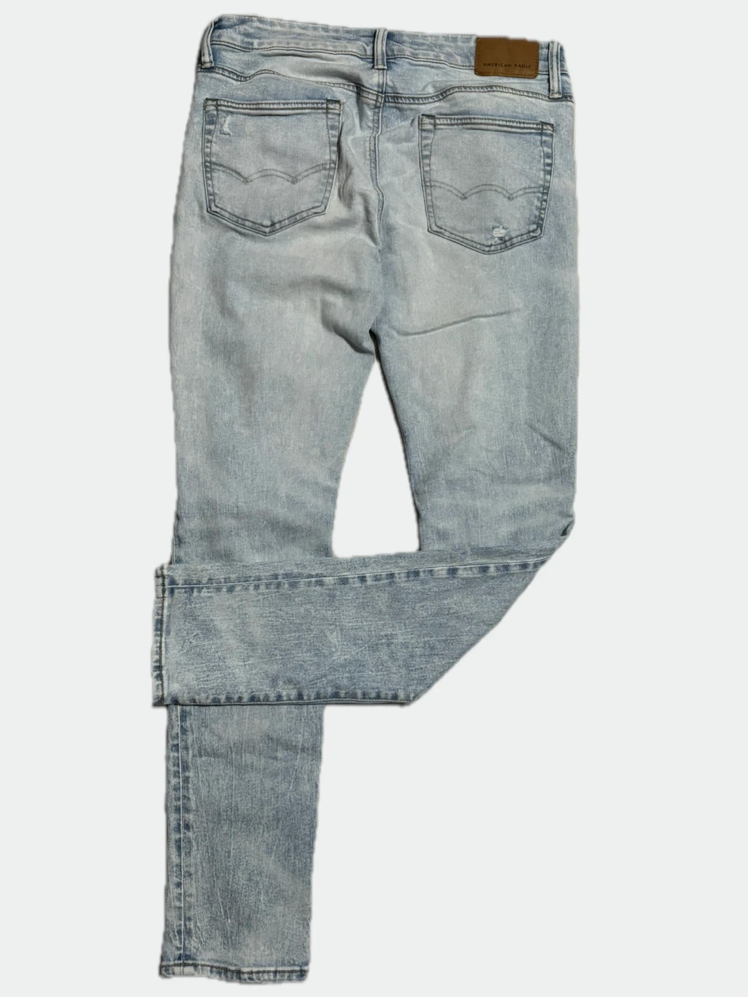 American Eagle jeans in size 32x32. They're a light wash and have a bit of a distressed look.
