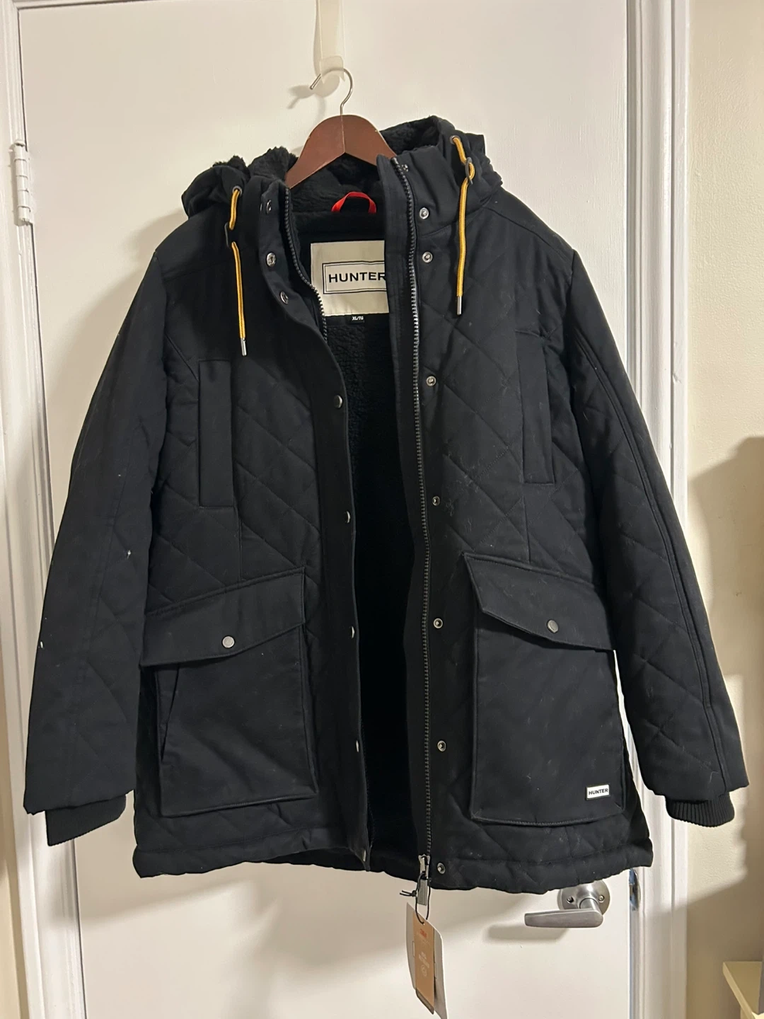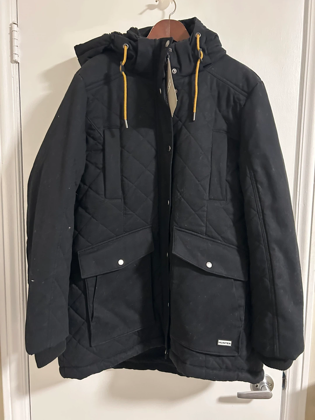 Selling a Hunter quilted jacket in black! It's brand new and ready for the colder weather. The jacket features a quilted design and a removable zippered hood, perfect for staying warm and stylish.