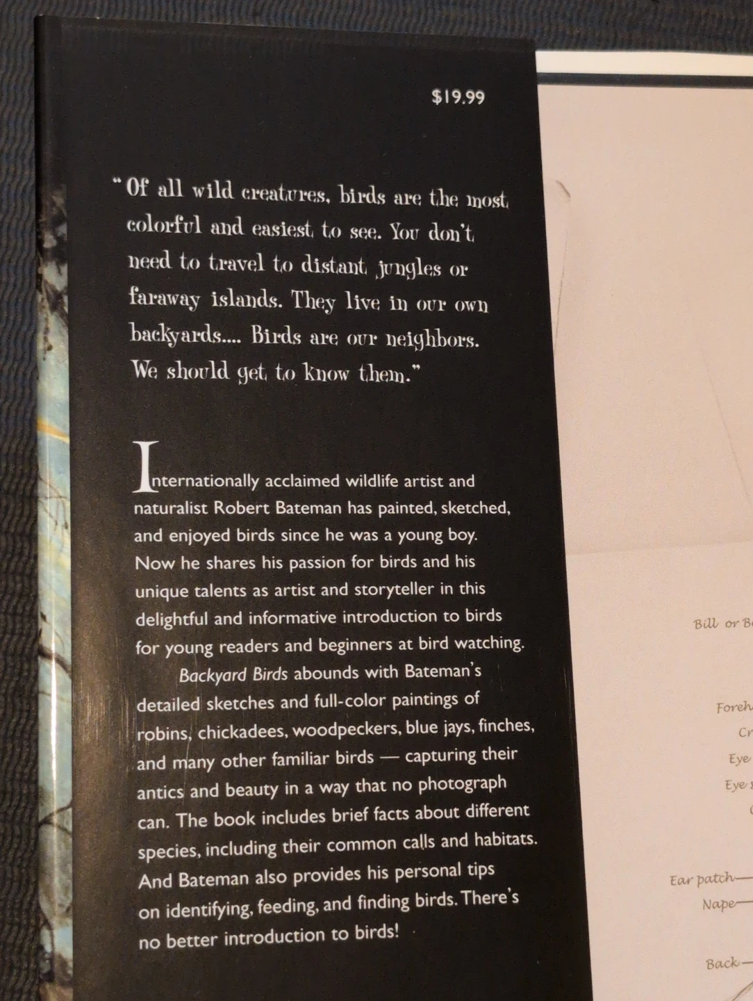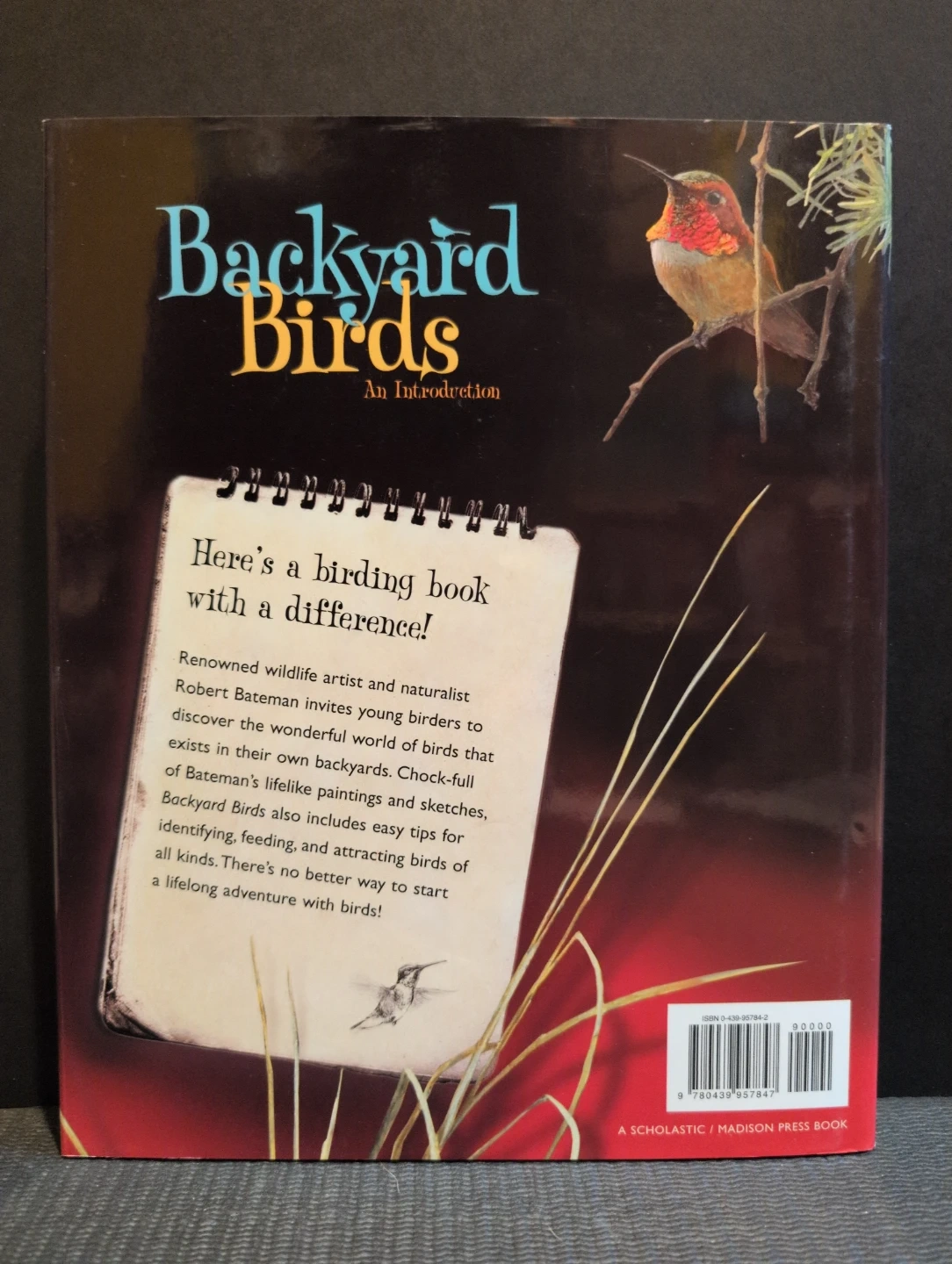 Selling a hardcopy of "Backyard Birds: An Introduction" by Robert Bateman. It's a delightful and informative book for beginners and young readers interested in birds. The book features detailed sketches and full-colour paintings of various familiar birds.