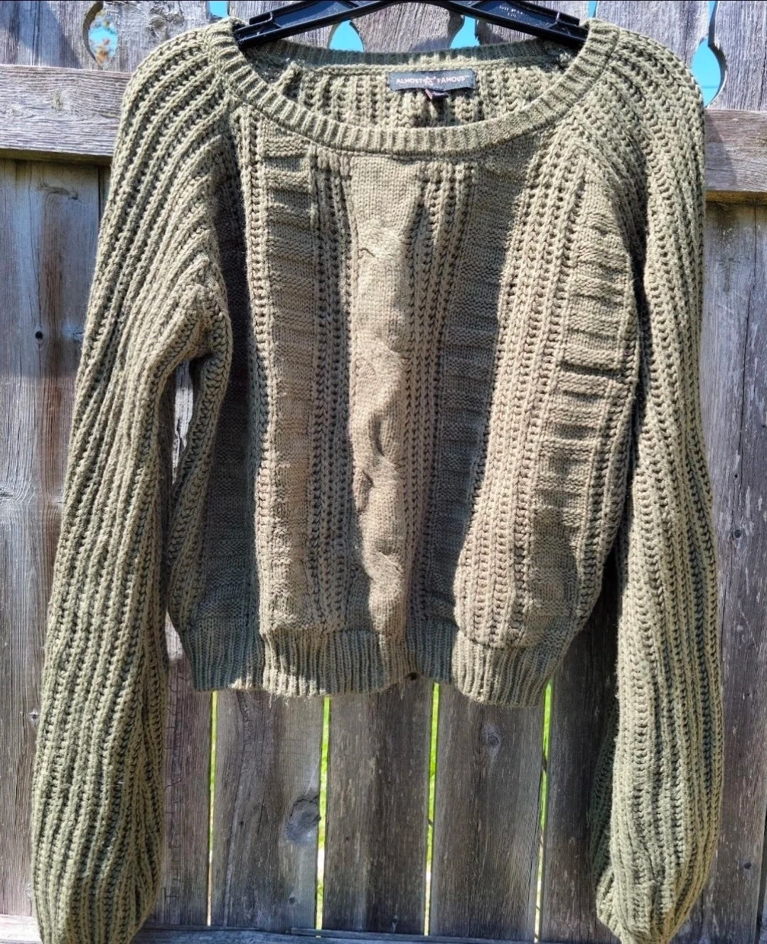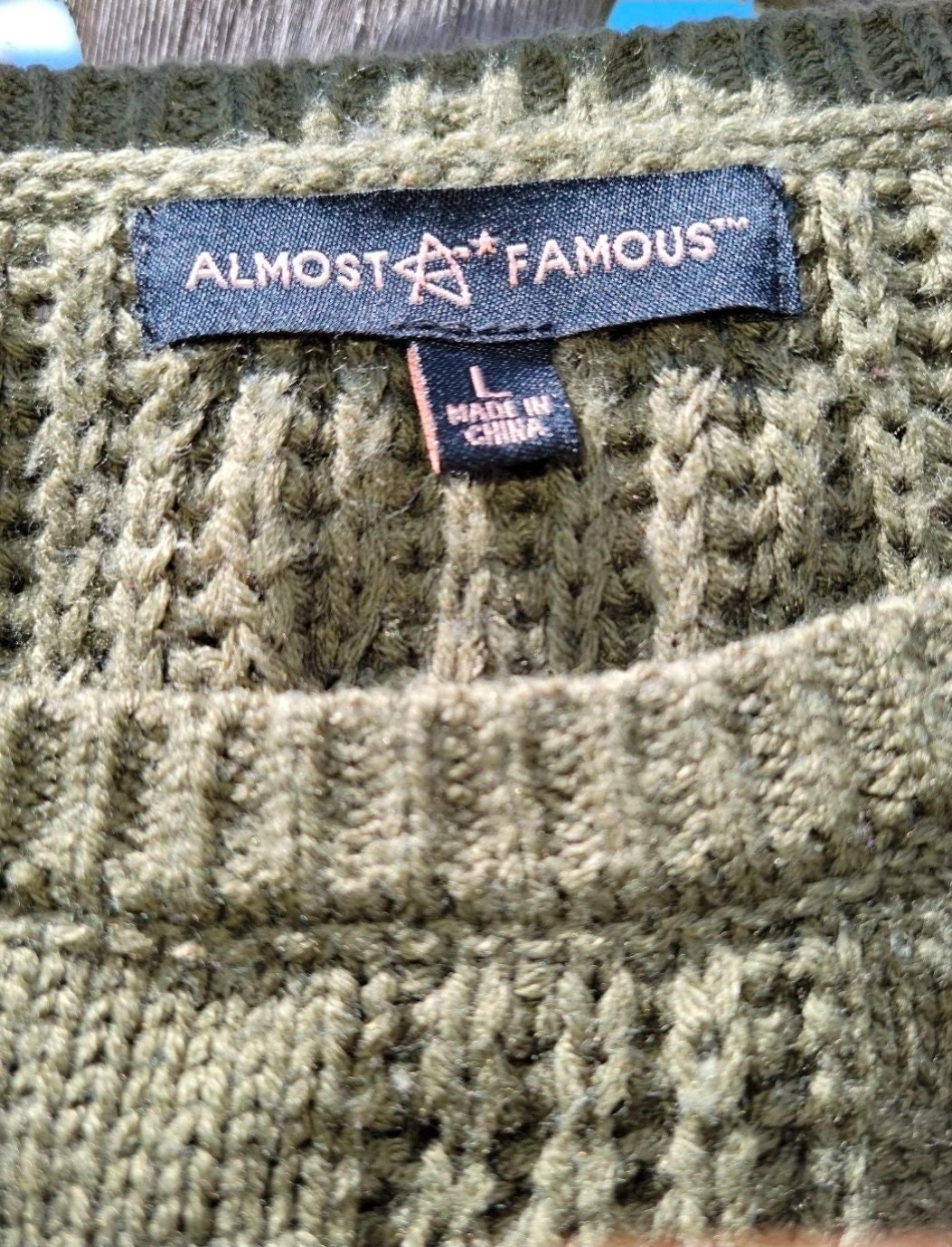Selling an Almost Famous sweater in size large! It's a cozy knit in a lovely olive green color. The material is 100% acrylic, so it's soft and easy to care for. Perfect for staying warm and stylish!