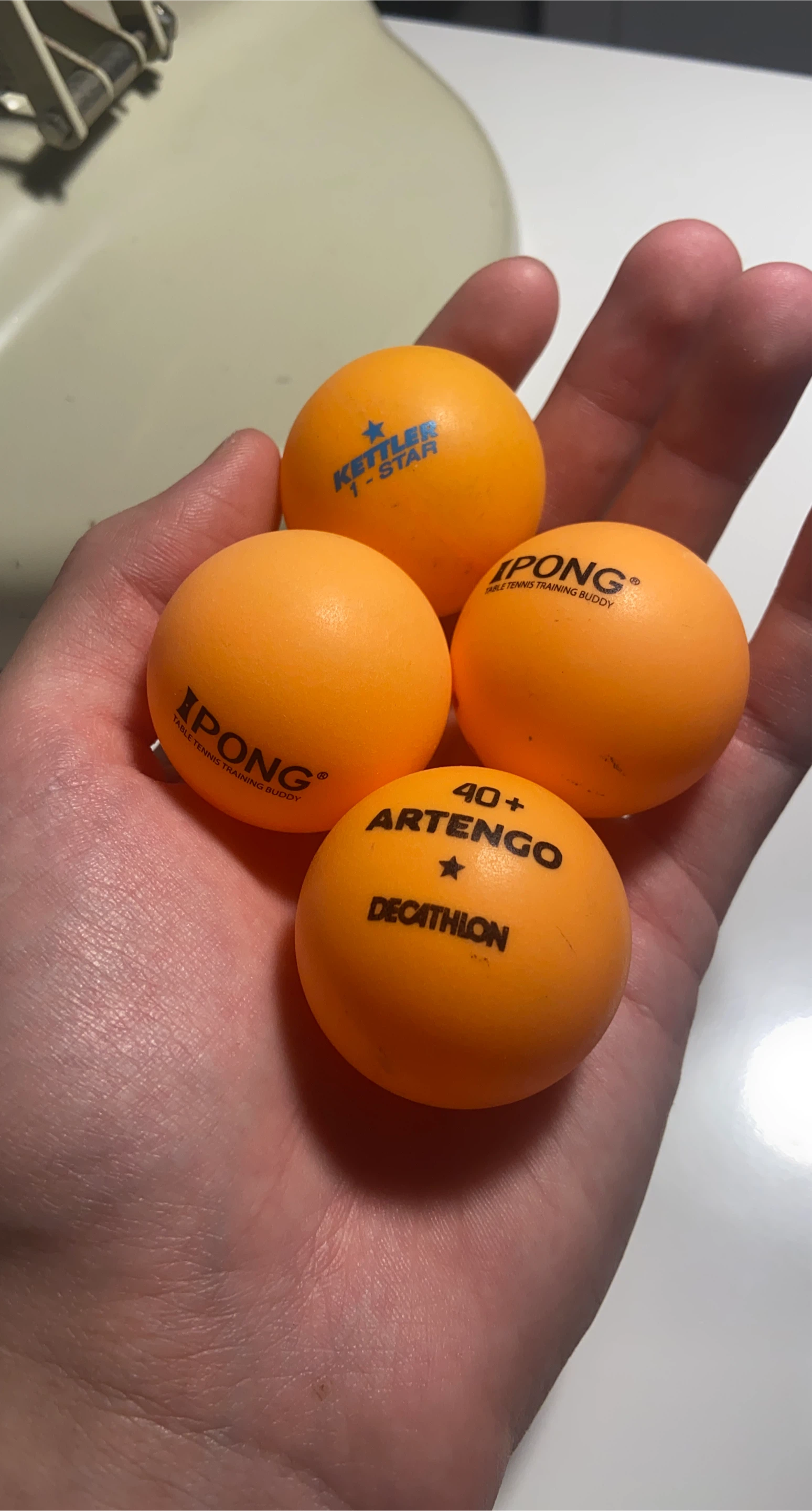 Selling a collection of table tennis balls! You'll find a mix of brands including Kettler 1-Star, IPONG Table Tennis Training Buddy, and Artengo 40+ from Decathlon. Perfect for practice or a casual game!
