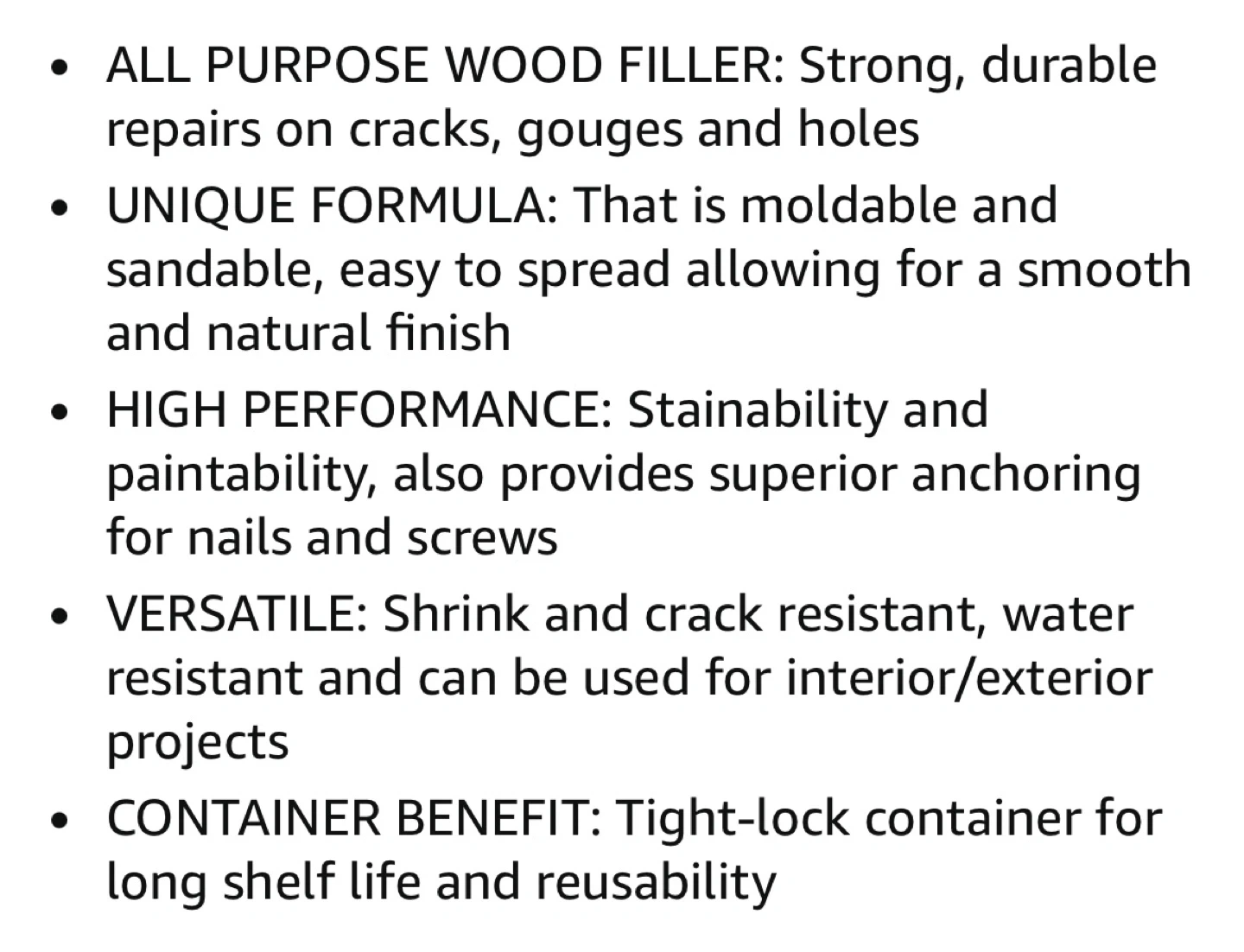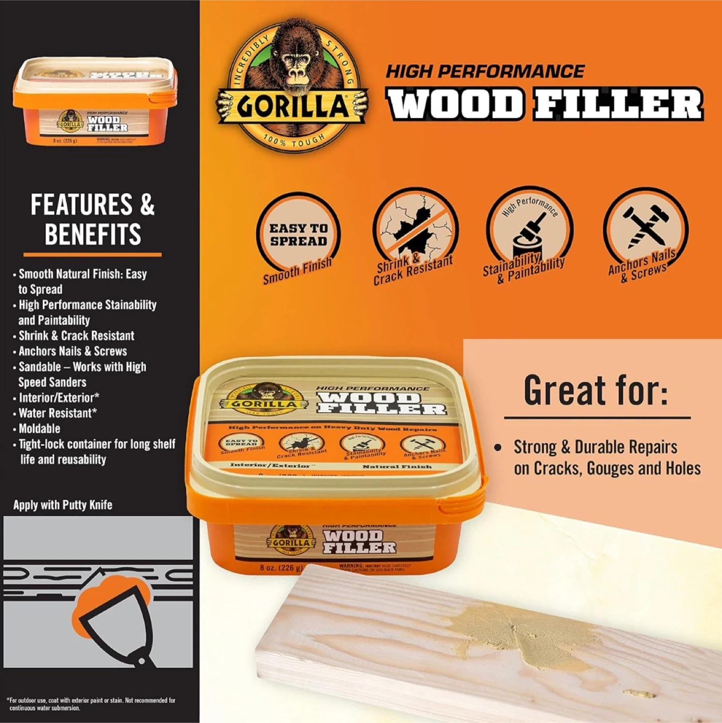 High-performance all-purpose wood filler by Gorilla. Strong, durable, and easy to work with.