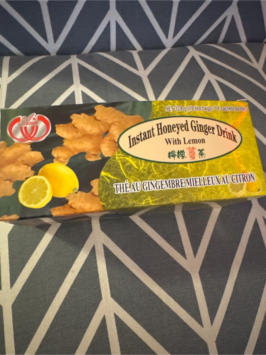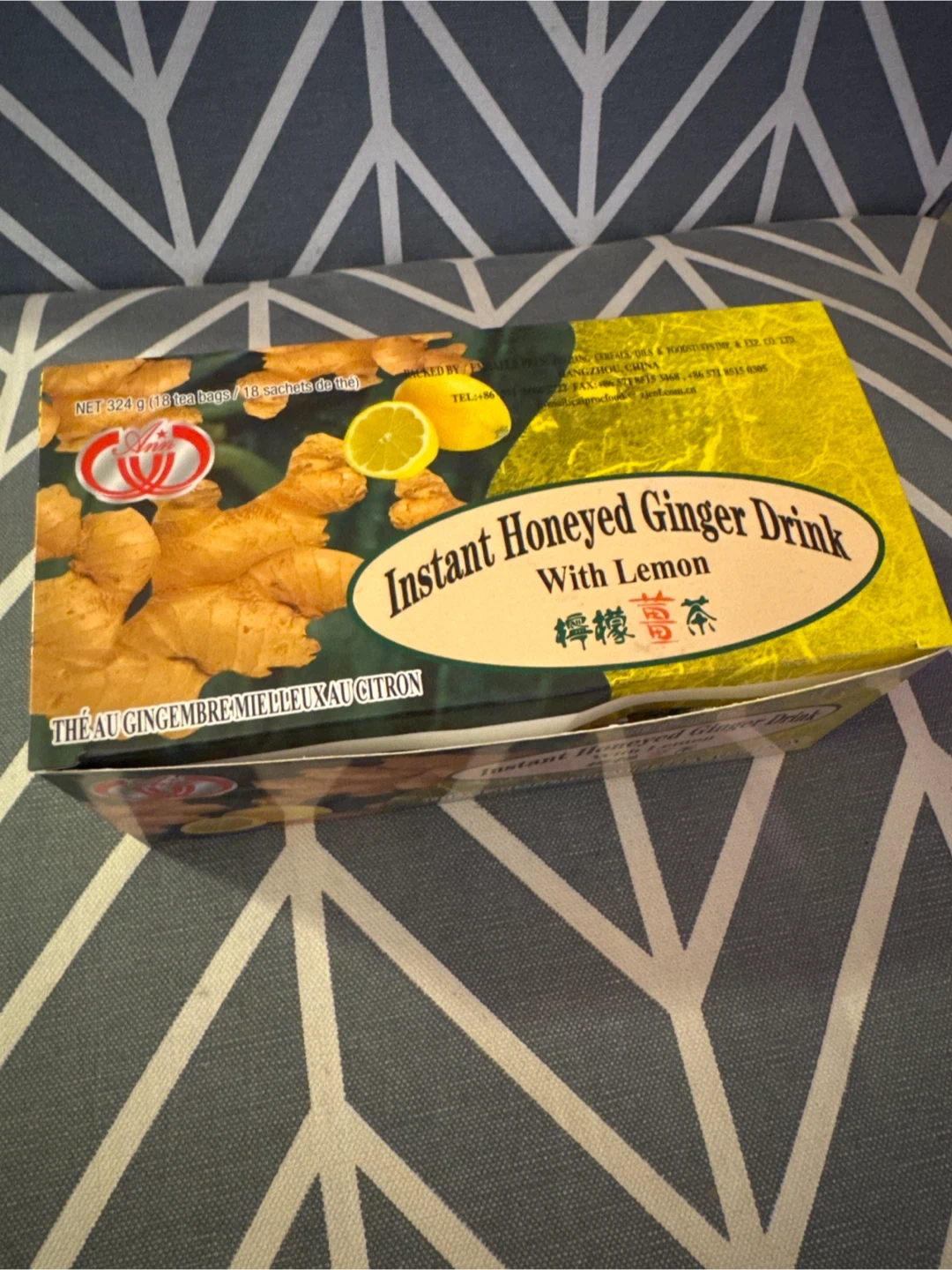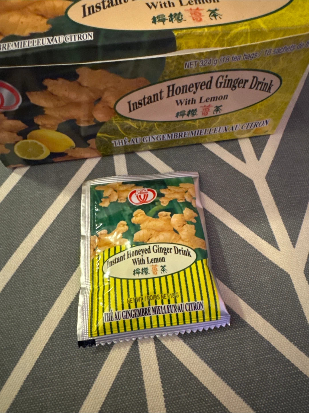 Selling an open box of Instant Honeyed Ginger Drink with Lemon. It contains 324 g / 18 tea bags, 13 left! Perfect for a cozy and soothing beverage!