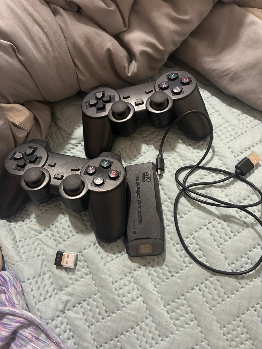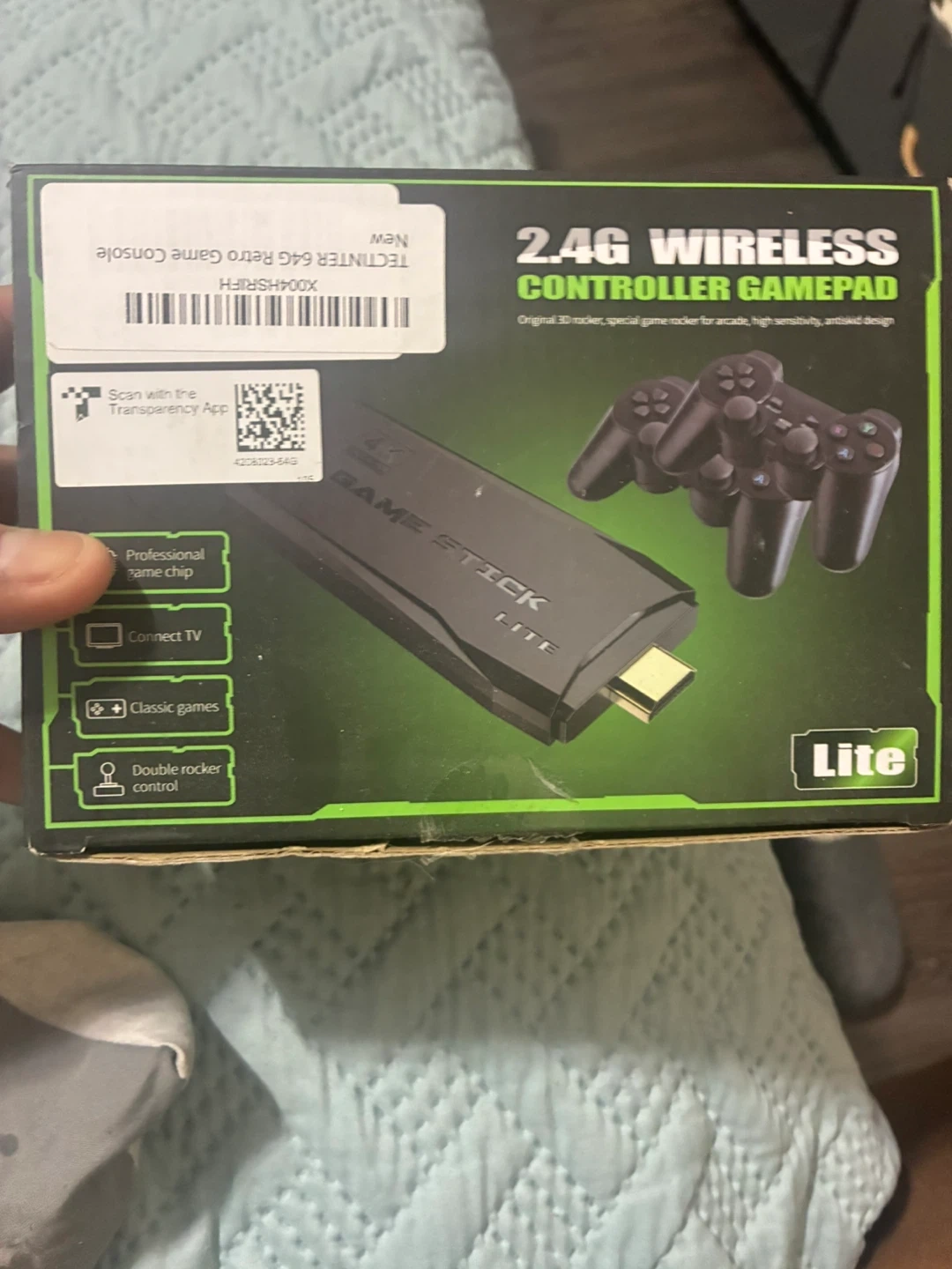 Selling a brand new TECTINTER 64G Retro Game Console. It features a 2.4G wireless controller gamepad with an original 3D rocker, special game rocker for arcade, high sensitivity, and antiskid design. It also has a professional game chip, connects to your TV, includes classic games, and has double rocker control