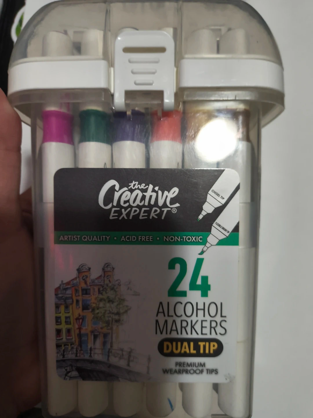 Selling a set of The Creative Expert alcohol markers! This set includes 24 dual-tip markers, perfect for artists and hobbyists alike. They're artist quality, acid-free, and non-toxic. Each marker has a chisel tip and a flexible brush tip for versatile use