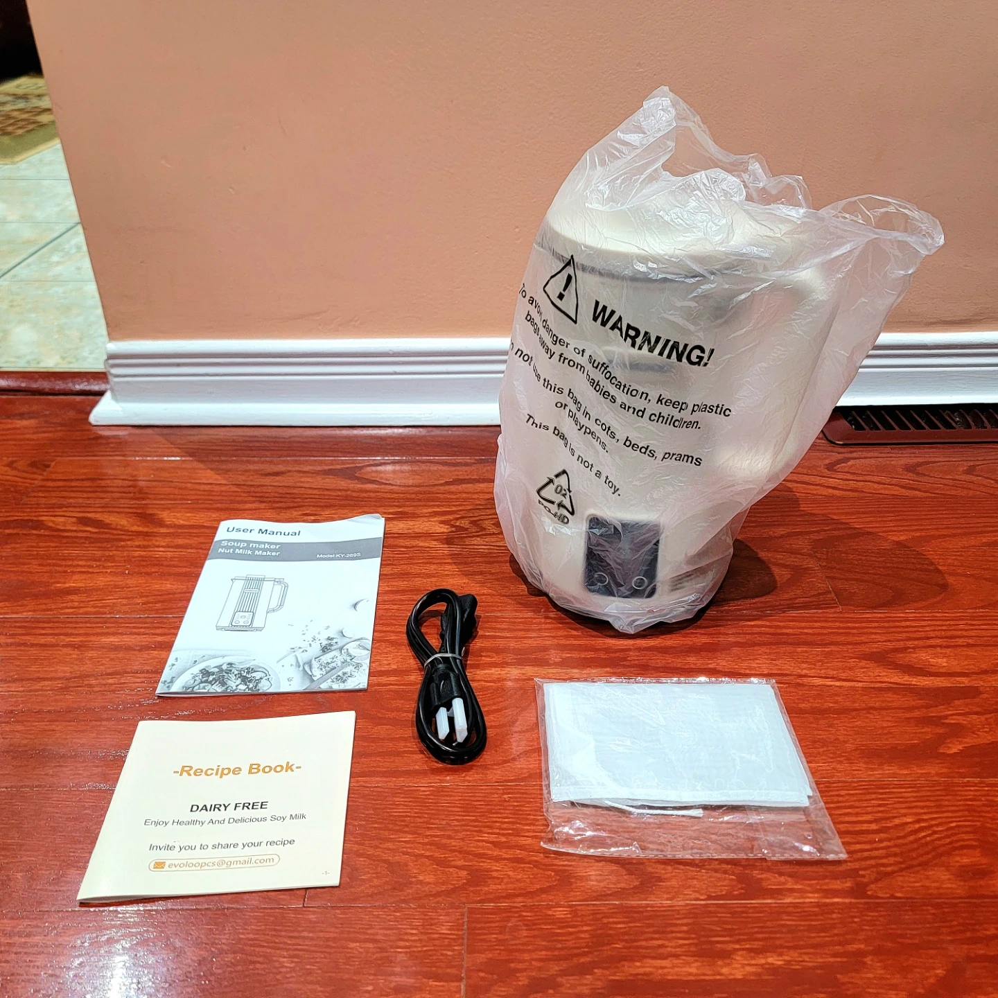 Evoloop Nut Milk & Soup Maker unit (with lid), power cord, premium nut milk bag, recipe book, and user manual.