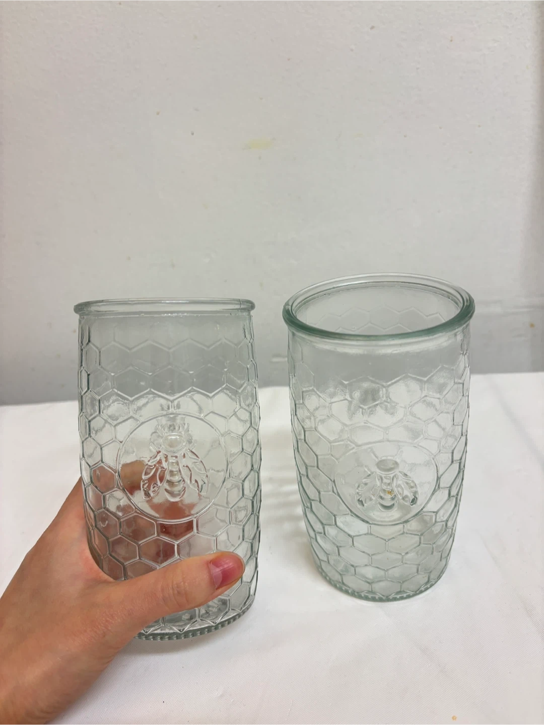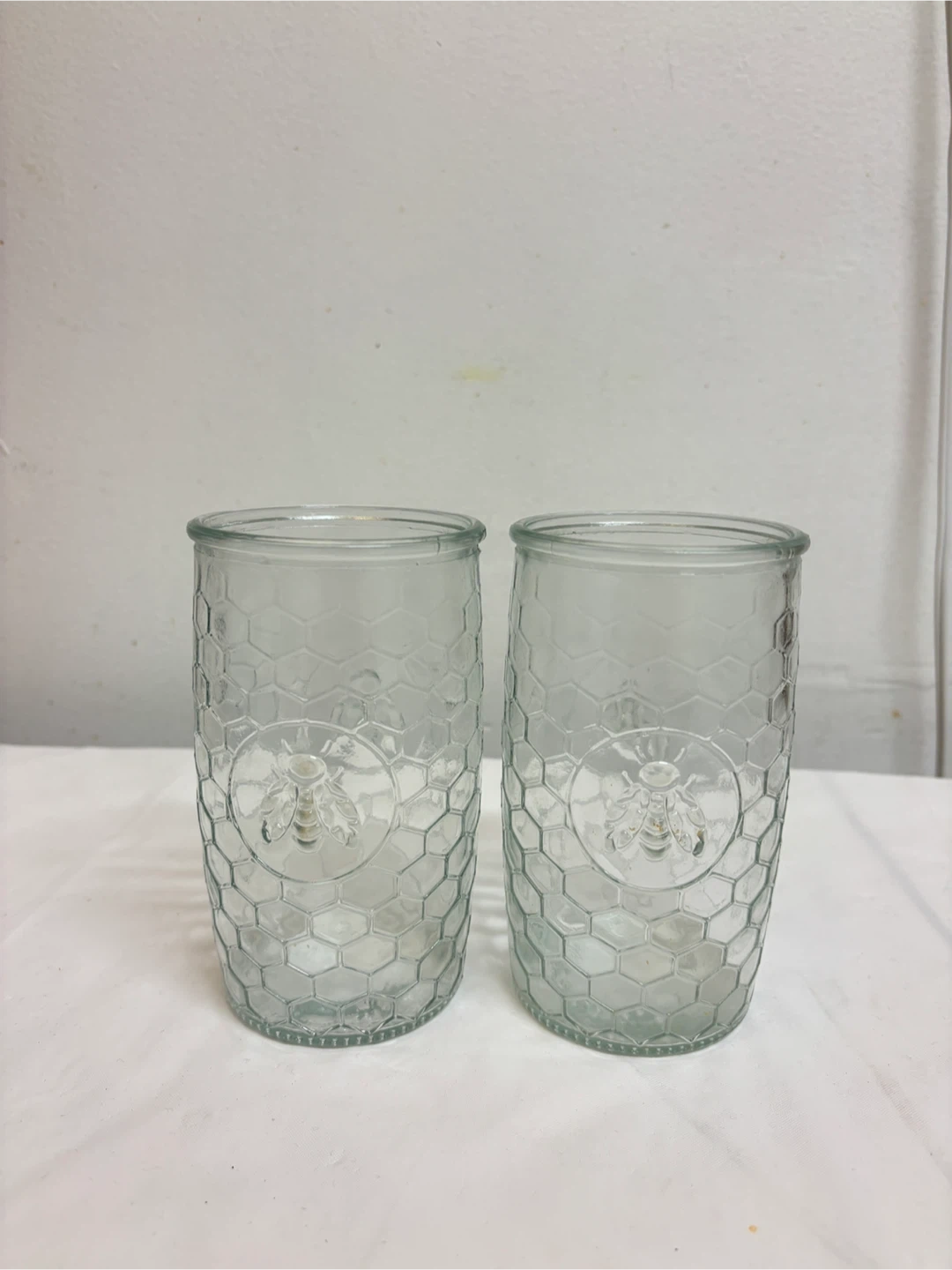 Selling two clear glass jars with a honeycomb pattern and a bee emblem. Two glass jar for total $1.