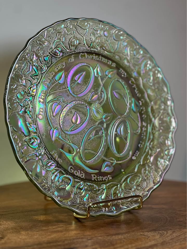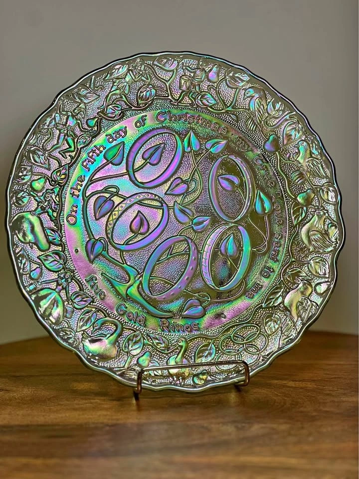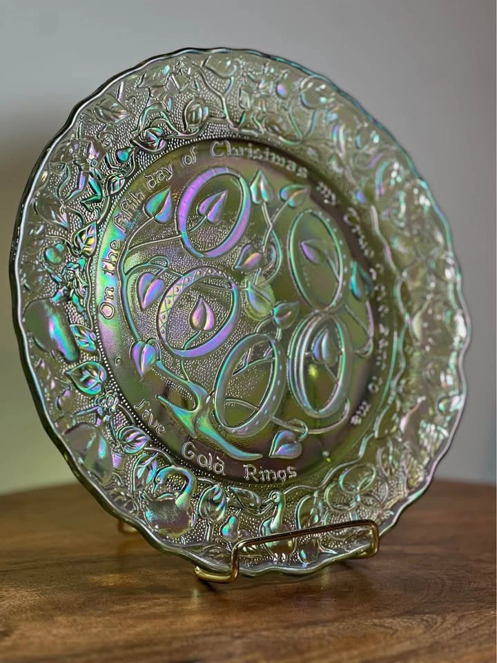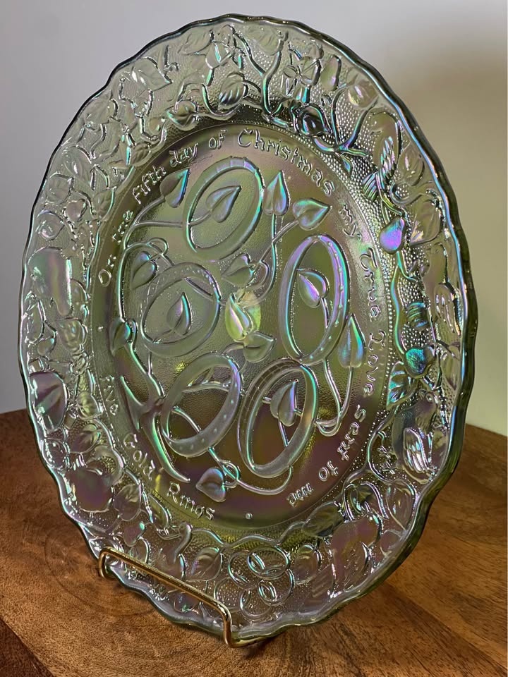 This is a vintage Imperial Glass Fifth Day of Christmas collector's plate. It is made of iridescent "carnival" glass, which gives it a shimmering, multi-colored appearance. The plate depicts the "Five Golden Rings" from the traditional Christmas carol, with the text "On the Fifth day of Christmas my true love sent to me Five Gold Rings" embossed around the rim. It measures approximately 9 inches across. The plate was part of a "Twelve Days of Christmas" series produced by Imperial Glass in the 1970s, with this specific plate dated 1974.