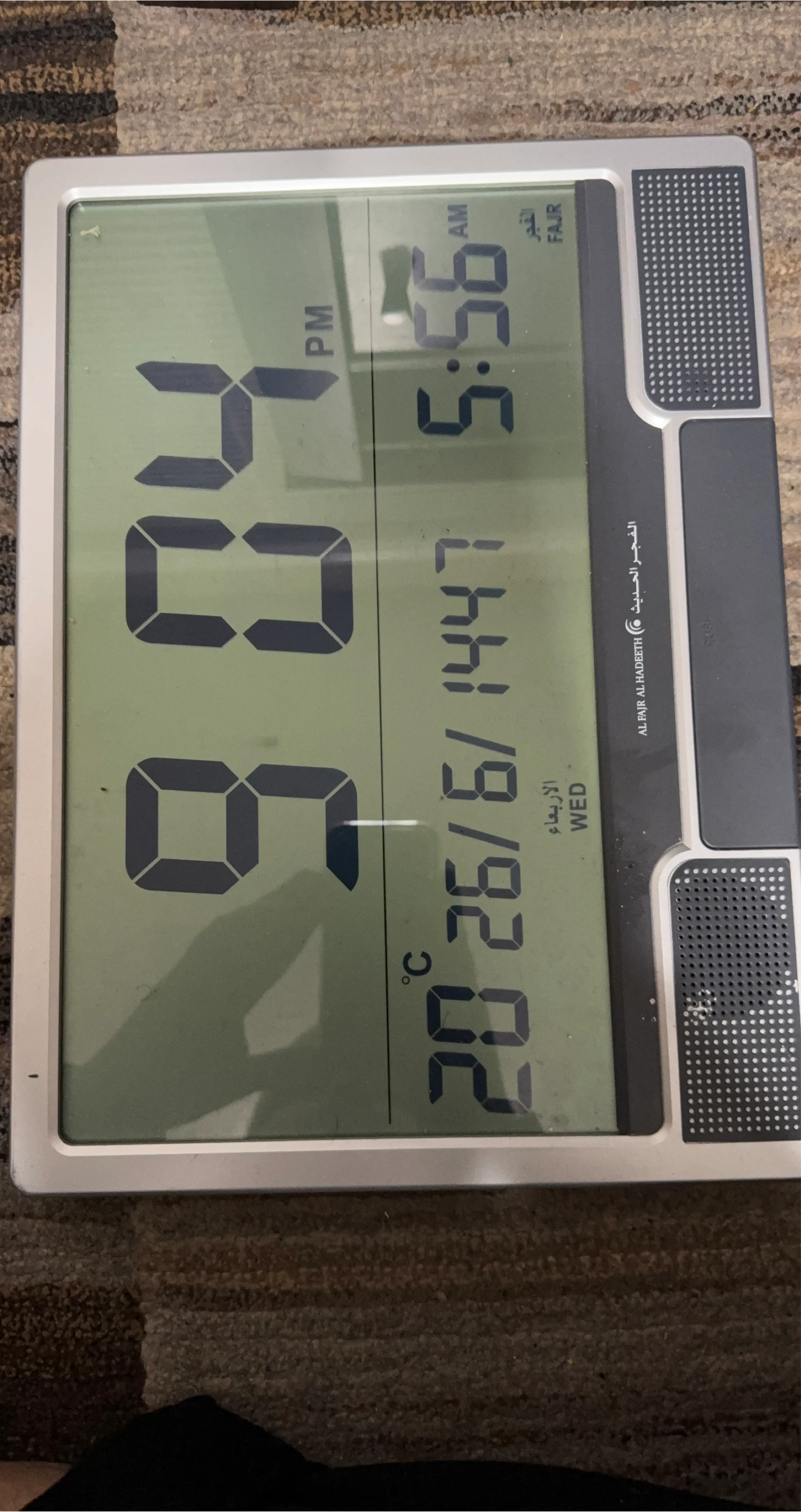 Digital Islamic wall clock showing the time, date, and prayer times. It also displays the temperature in Celsius