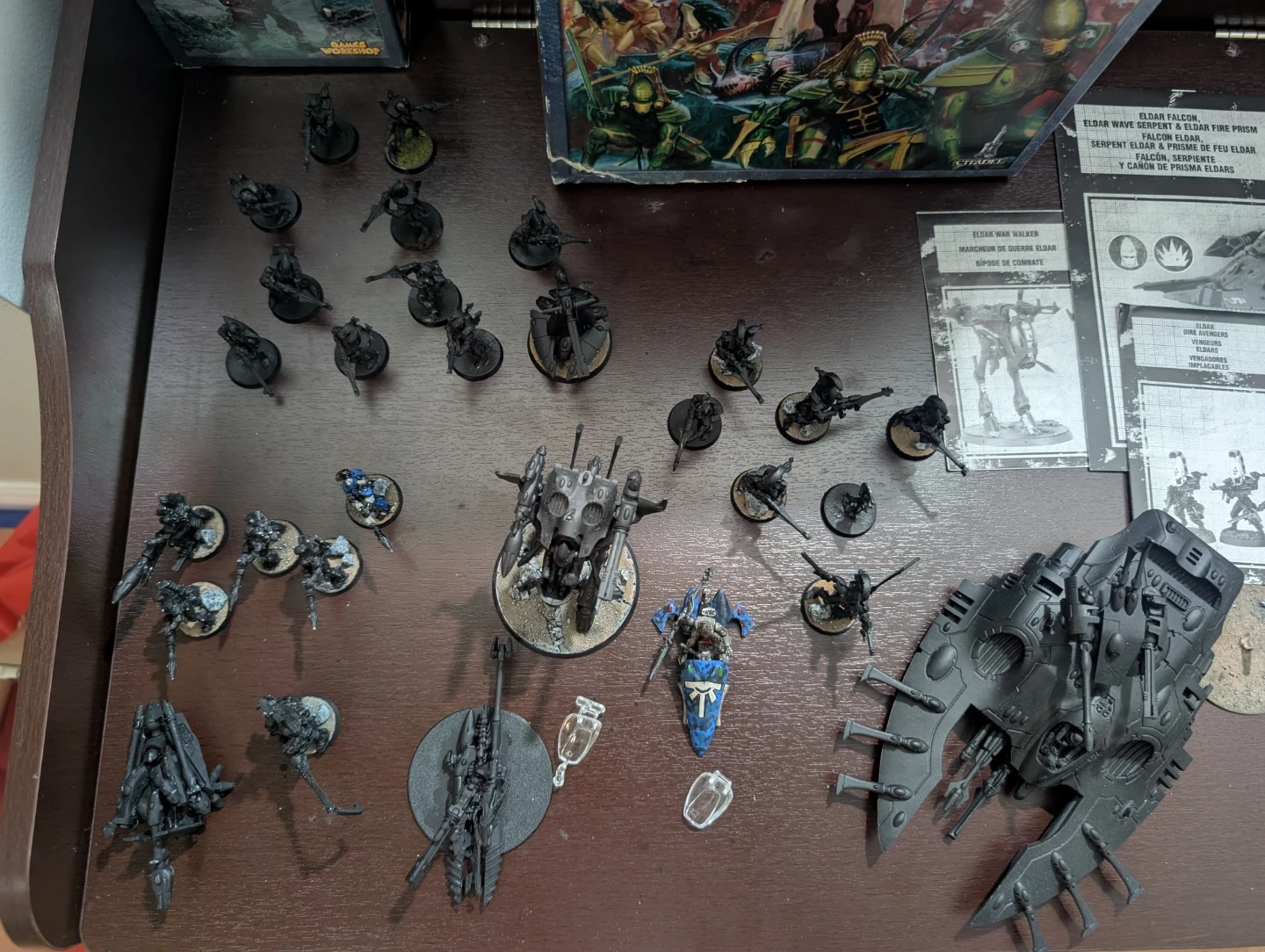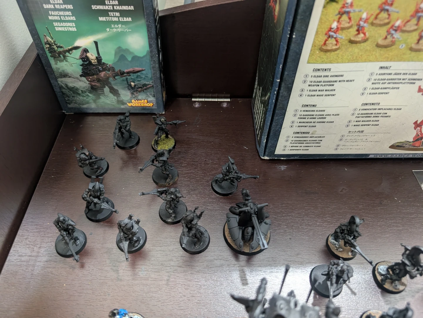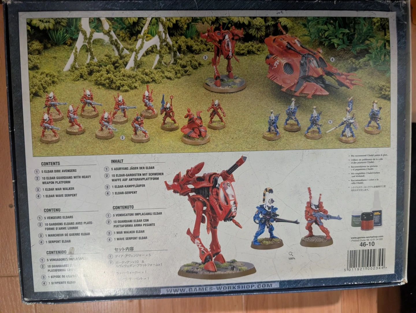 This set includes the complete 4th edition Battle force which contains 6 Dire Avenger (+1 extra) 10 Eldar Guardians with a heavy weapons platform, a War Walker and a Wave Serpent. Additionally included is a custom Farseer on a Jet bike, a Squad of Eavy Metal Dark Reapers, an Metal Phoenix Lord Maugan Ra and two Custom Heavy Weapons platforms.