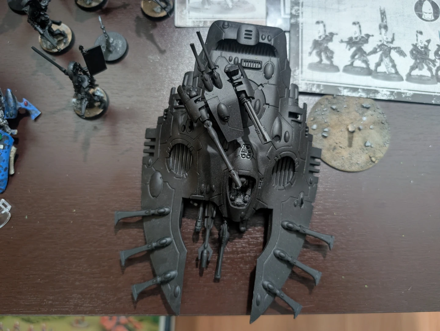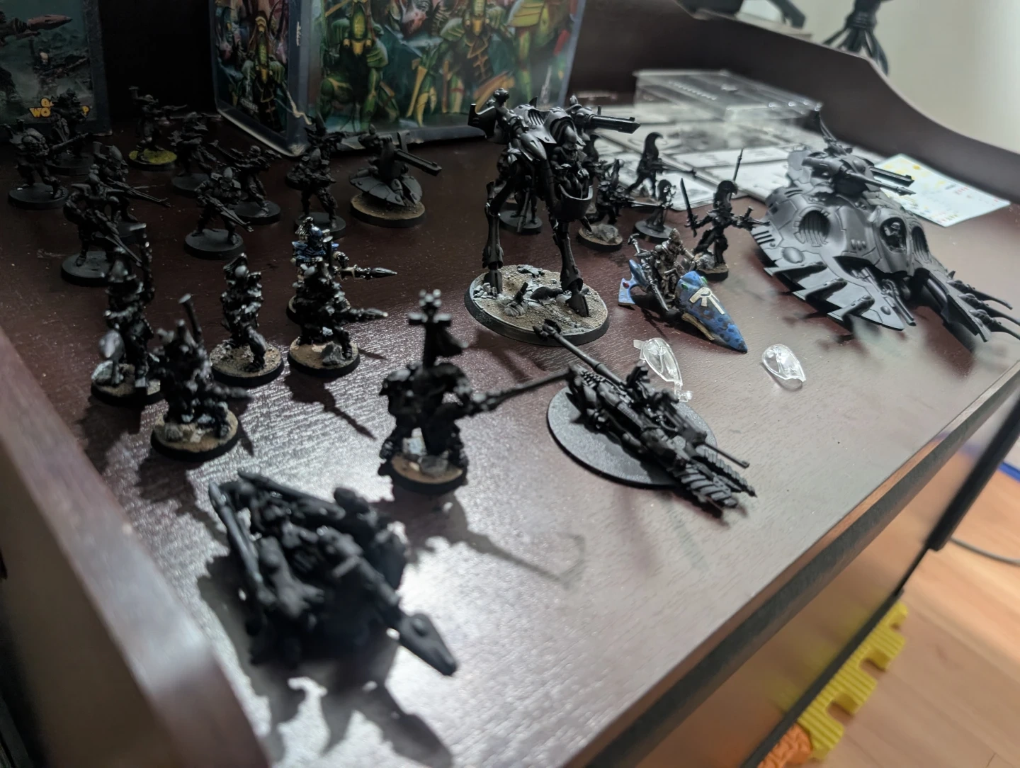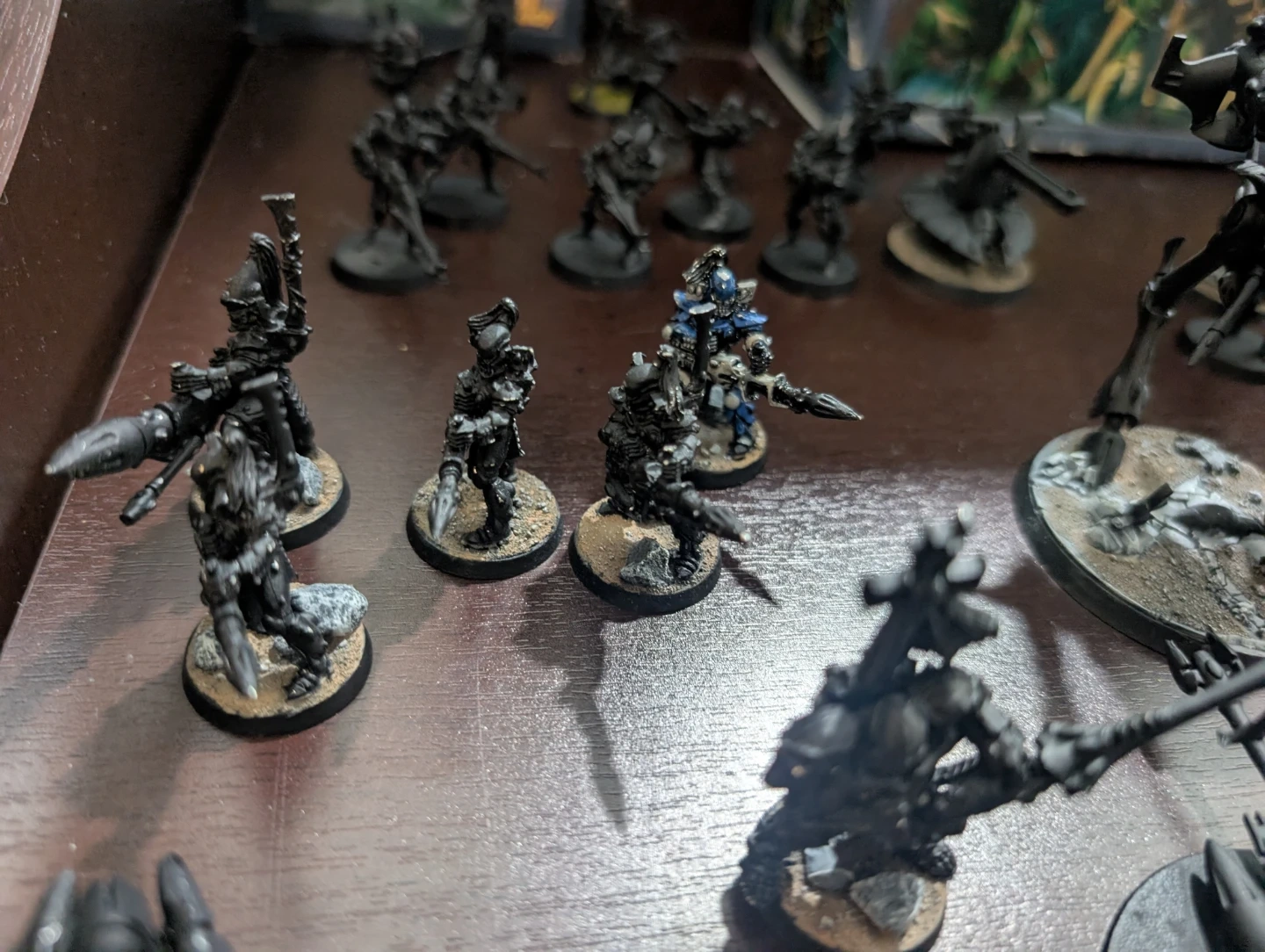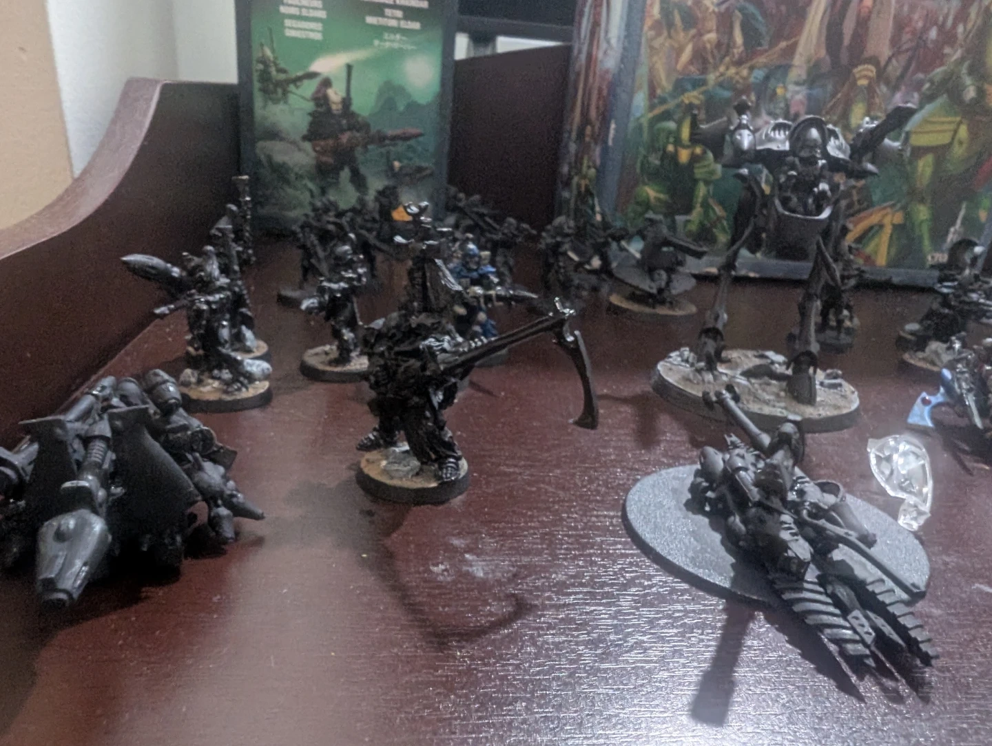 This set includes the complete 4th edition Battle force which contains 6 Dire Avenger (+1 extra) 10 Eldar Guardians with a heavy weapons platform, a War Walker and a Wave Serpent. Additionally included is a custom Farseer on a Jet bike, a Squad of Eavy Metal Dark Reapers, an Metal Phoenix Lord Maugan Ra and two Custom Heavy Weapons platforms.
