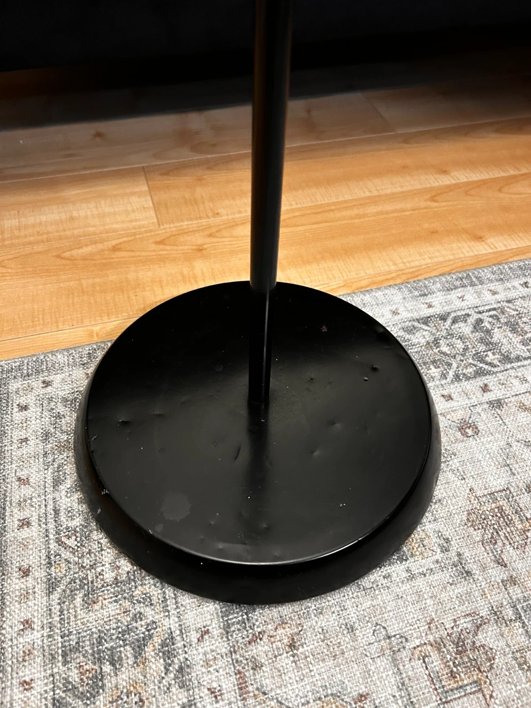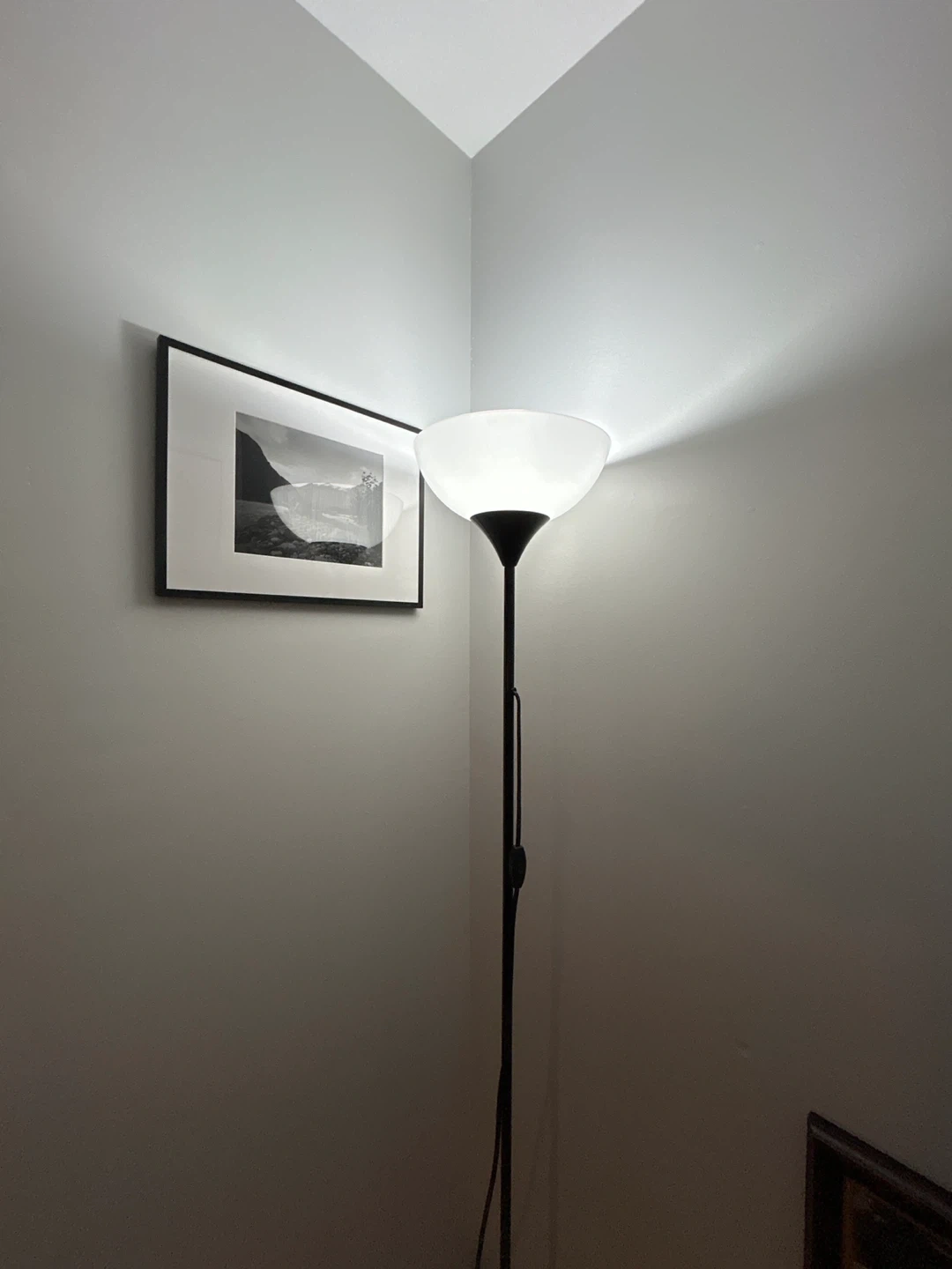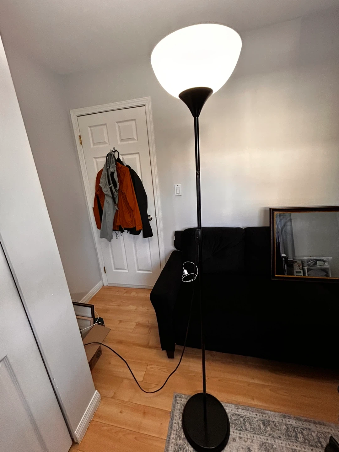 Selling a black floor lamp in great condition! It's a sleek and simple design that fits well in any room. It provides a nice ambient light and is easy to set up
