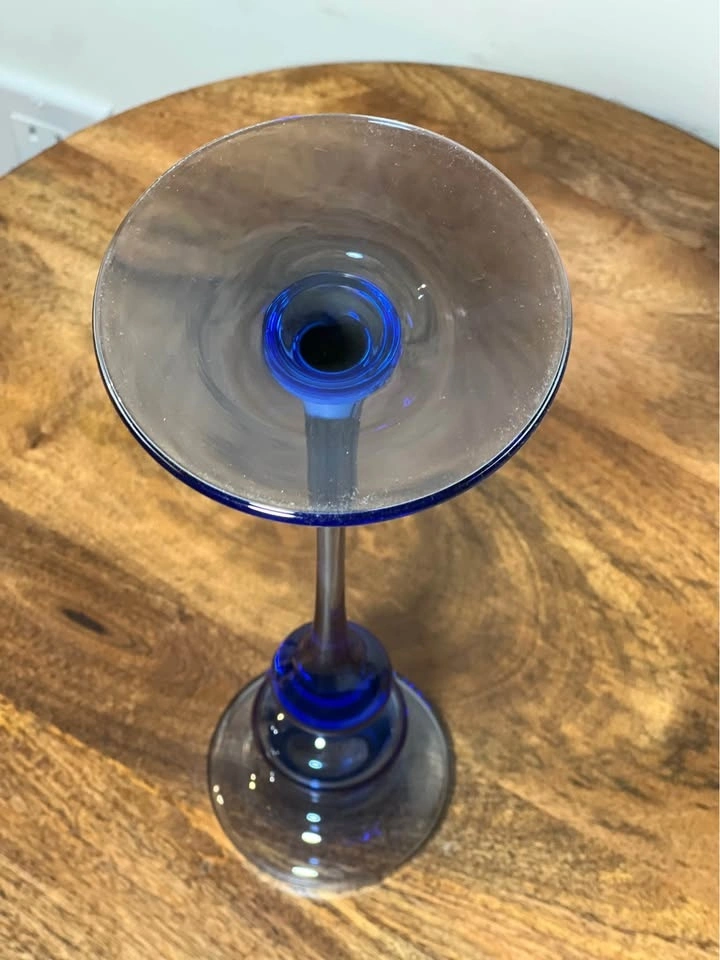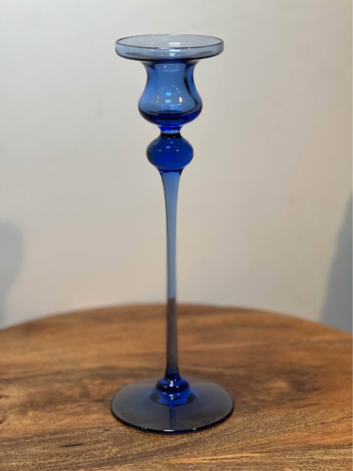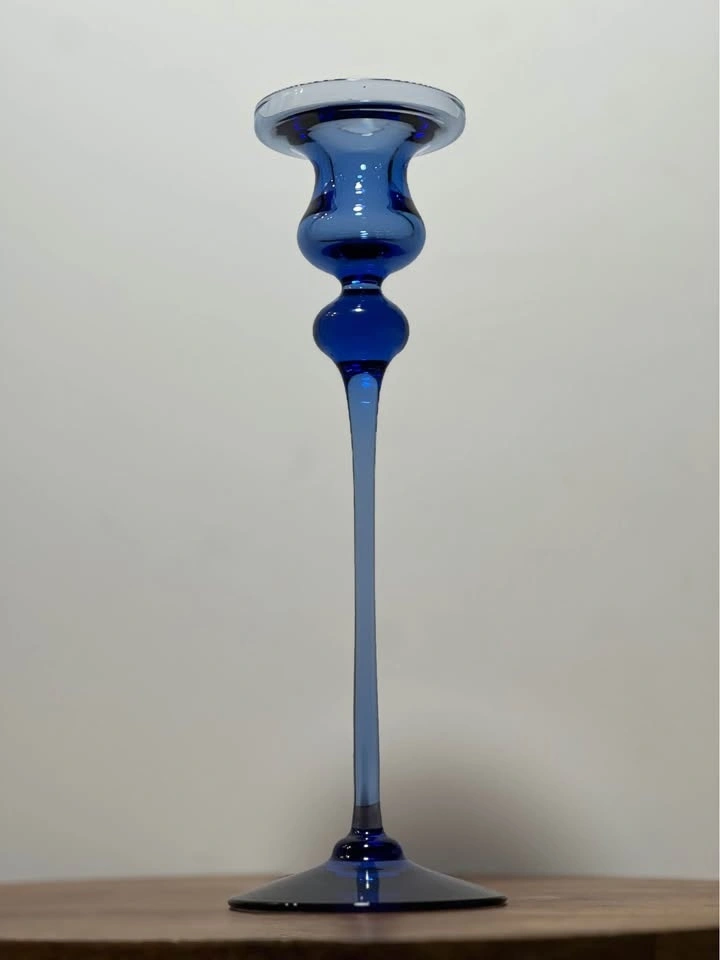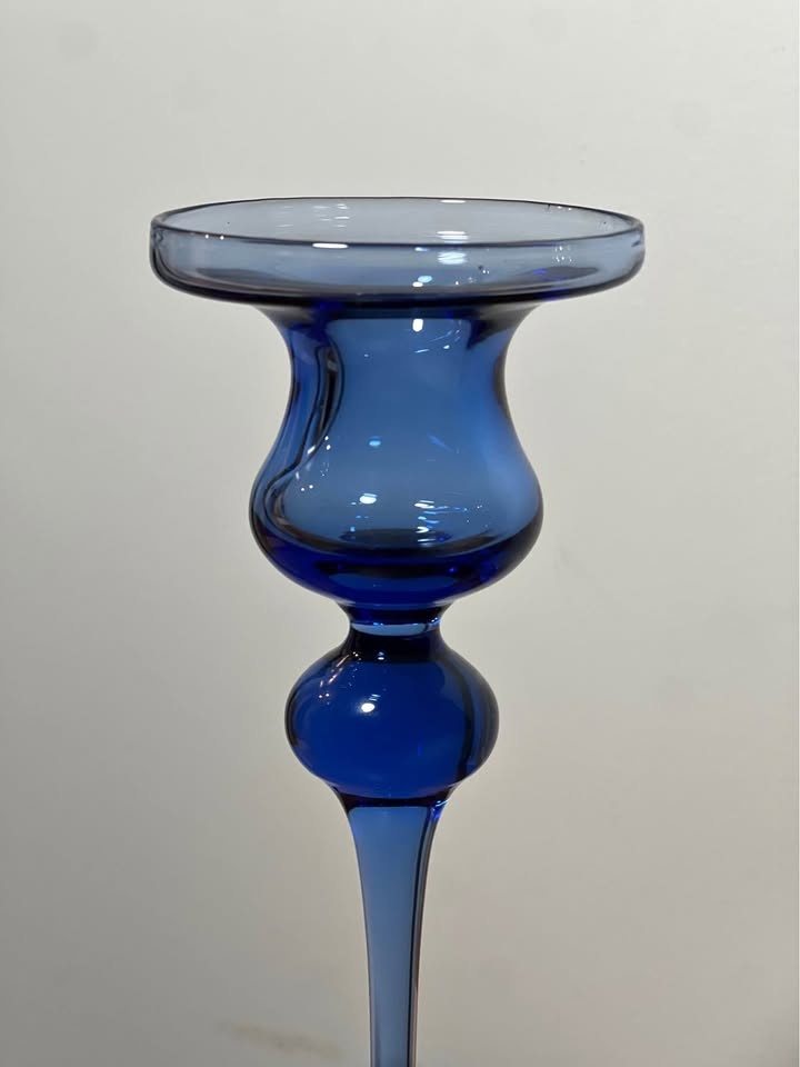 This candlestick is a Holmegaard Cassiopeia art glass candlestick, designed by Torben Jørgensen in 1984. It is made of hand-blown cobalt blue glass. Designer/Manufacturer: Torben Jørgensen for Holmegaard, a Danish glass manufacturer. Design/Era: The design is from the Mid-Century Modern era, introduced in 1984 and discontinued in 2000. Dimensions: This particular size measures approximately 11 1/2 inches tall. Features: The elegant design features a tall, slim stem with a distinctive bubble or knop and a flared top. Pickup is 58th and 7th Ave in midtown Manhattan