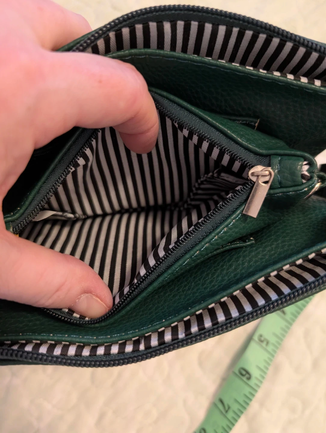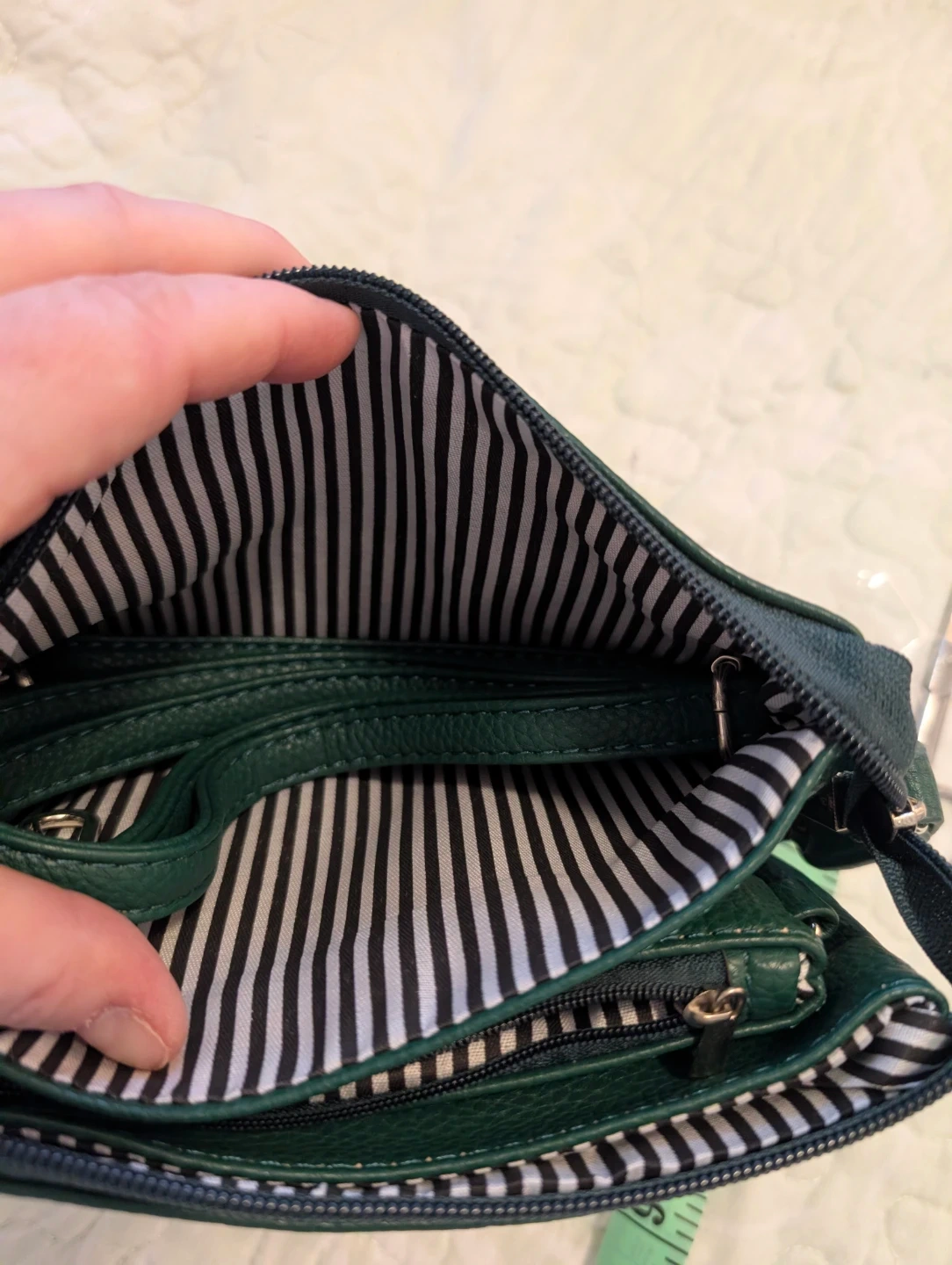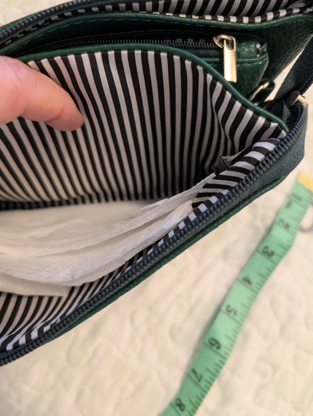 I'm selling a cute green crossbody bag! It's perfect for carrying your essentials. The bag has a striped black and white interior lining and multiple compartments for organization. It measures approximately 8.5 inches long and 5 inches high.