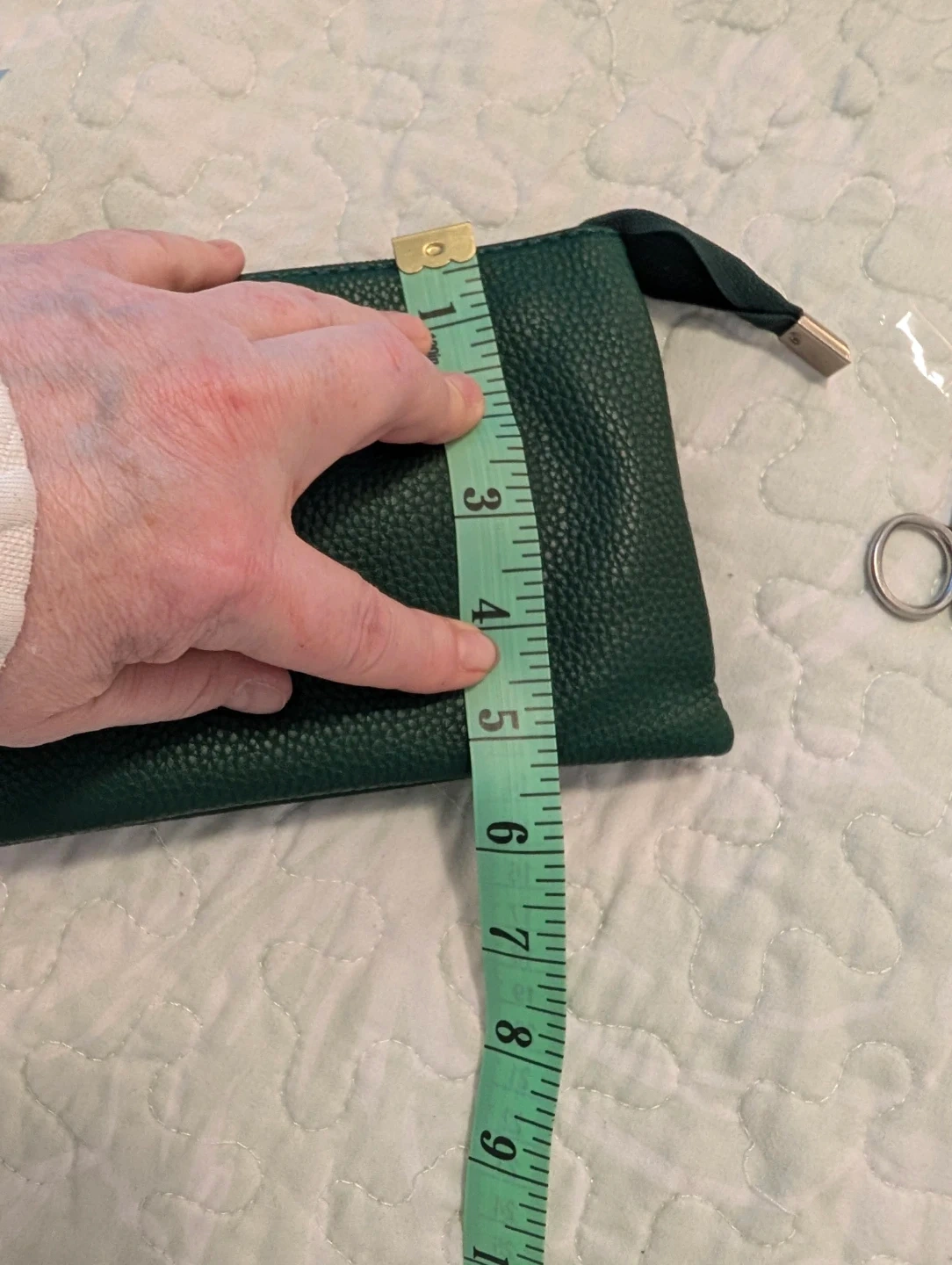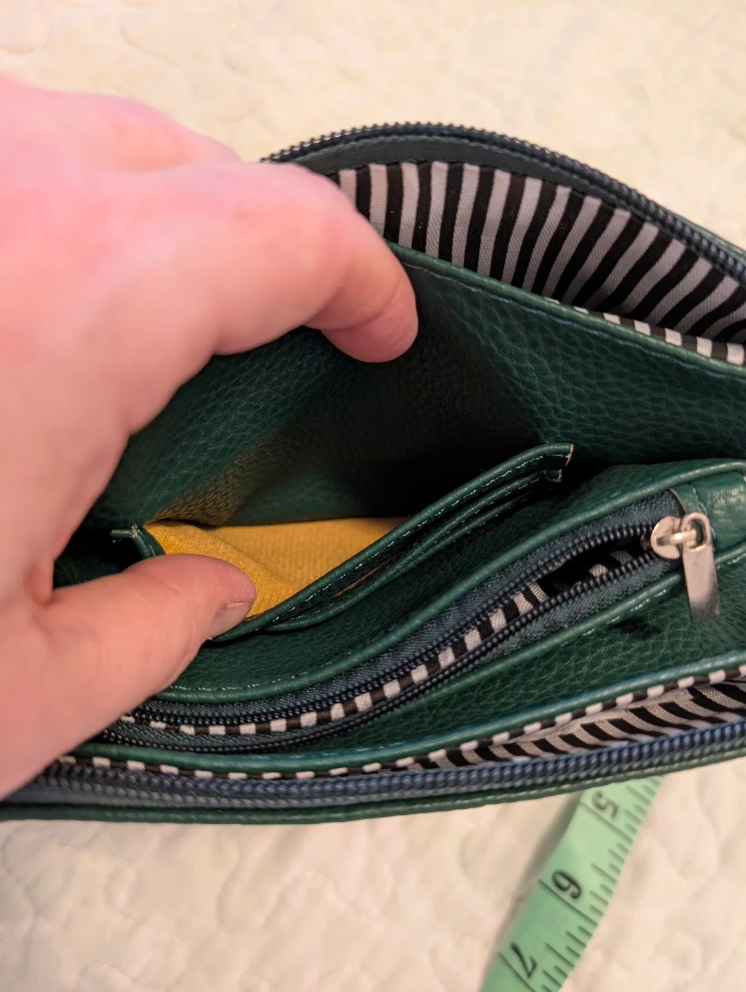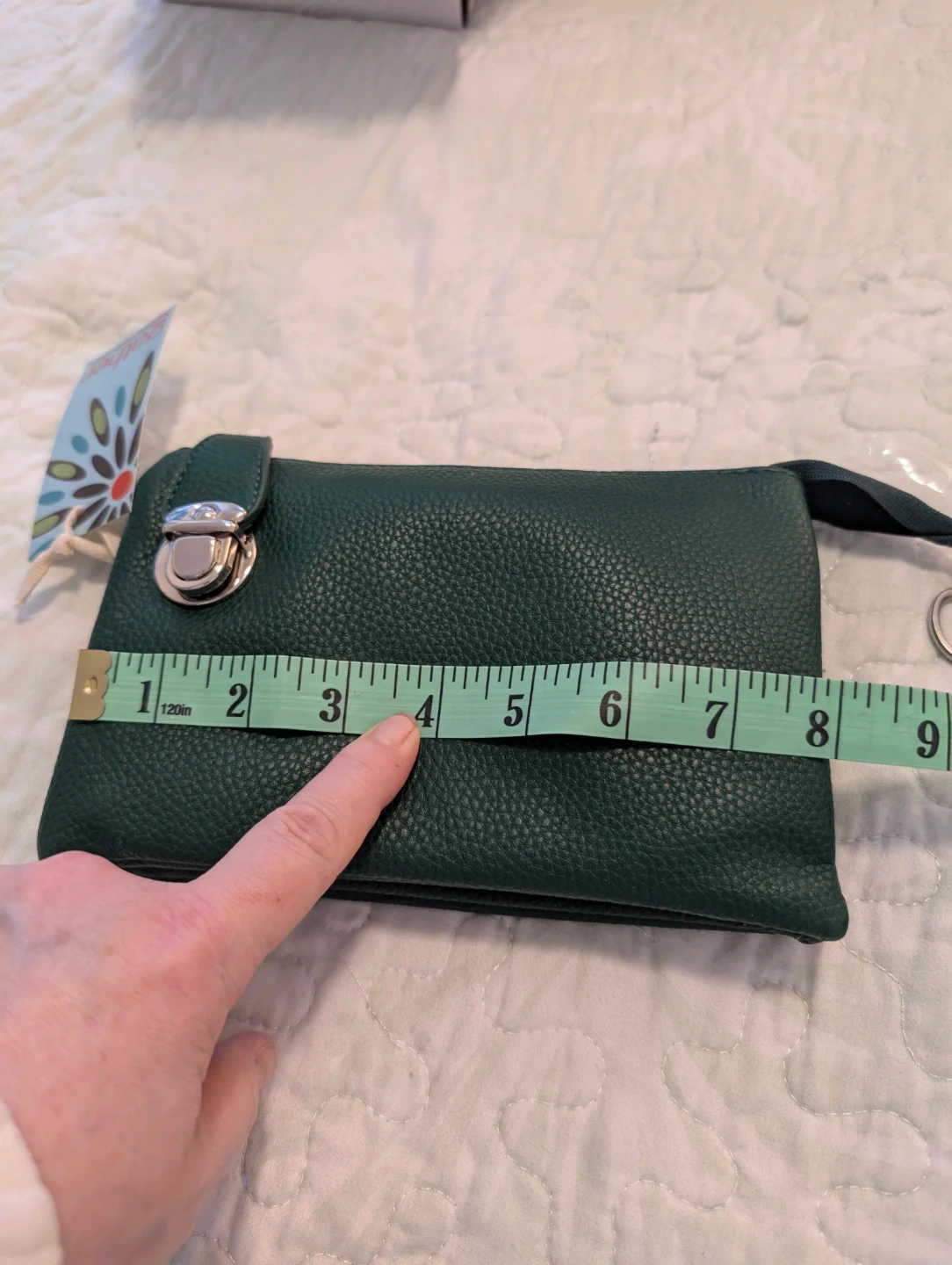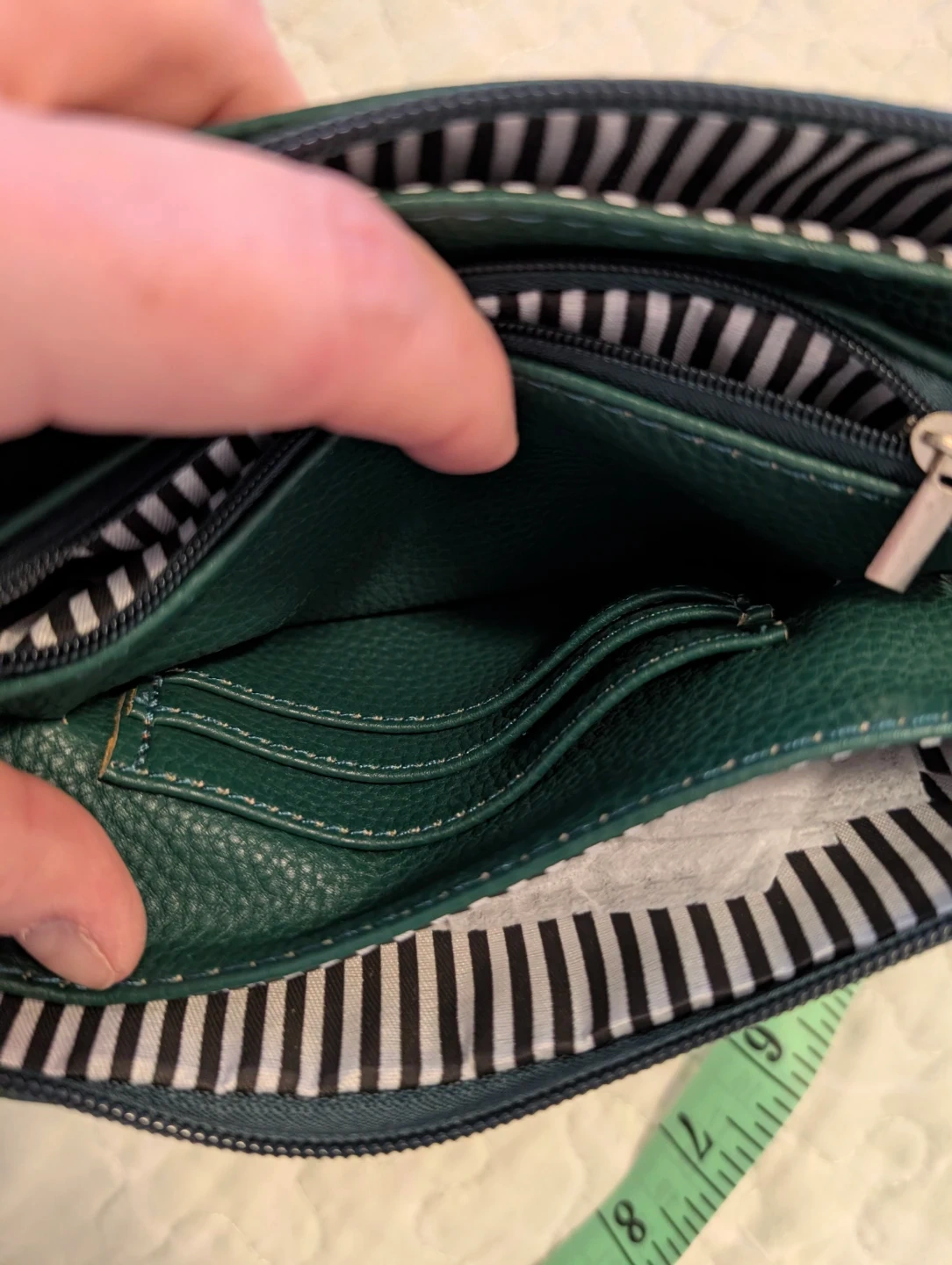 I'm selling a cute green crossbody bag! It's perfect for carrying your essentials. The bag has a striped black and white interior lining and multiple compartments for organization. It measures approximately 8.5 inches long and 5 inches high.