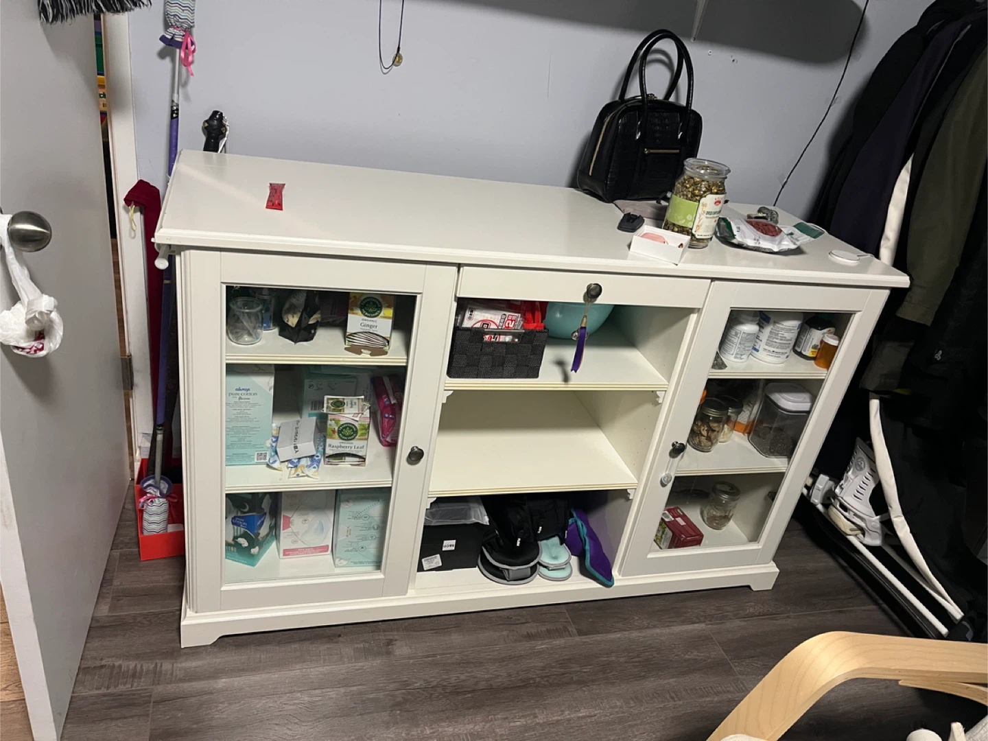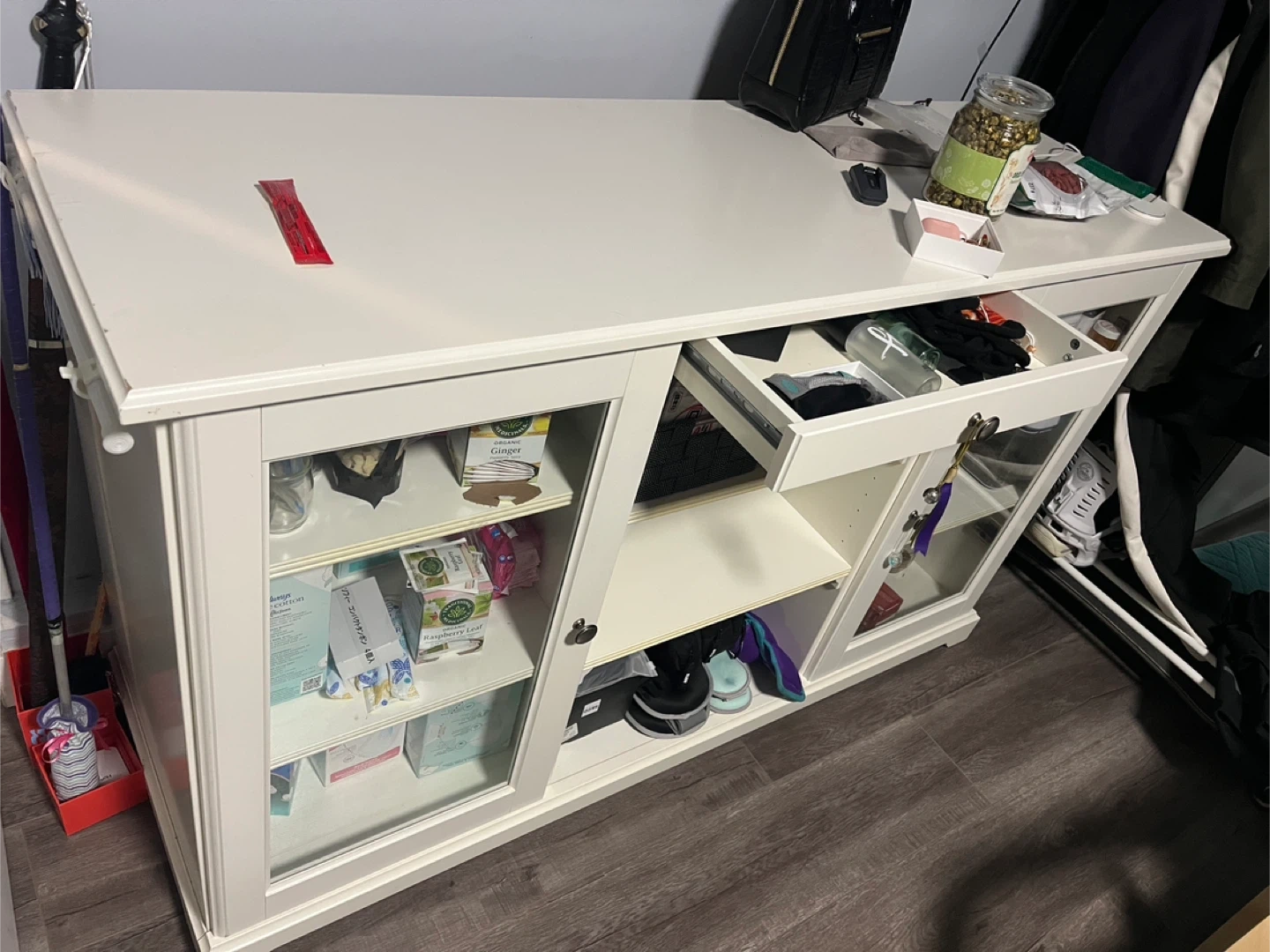 Clear side doors excellent for storing movies/games. Small drawer excellent for remotes/controllers.