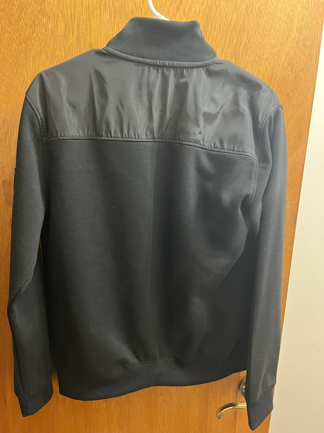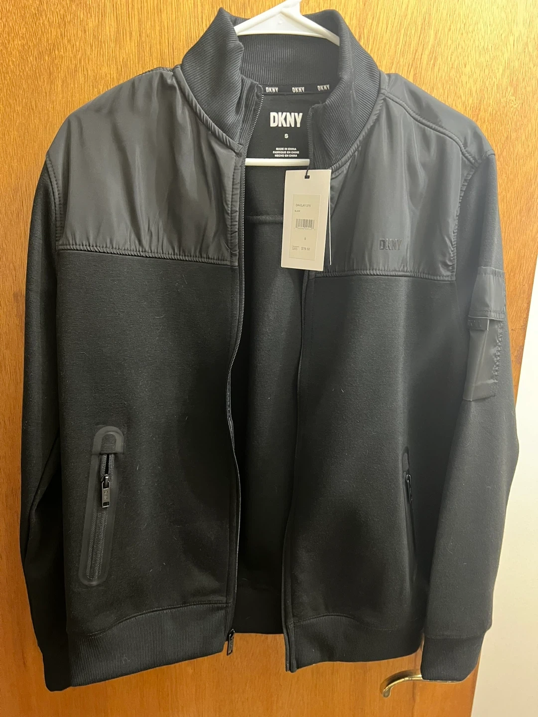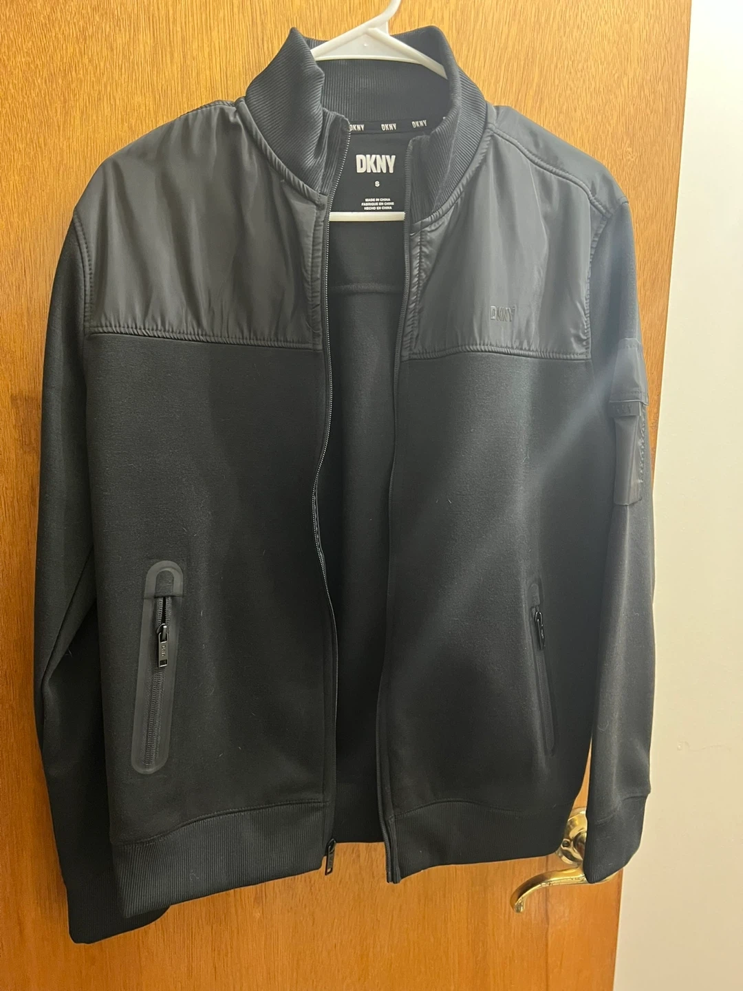 Selling a DKNY men's bomber jacket in black. It's a size S and in great condition. Perfect for layering or wearing on its own!