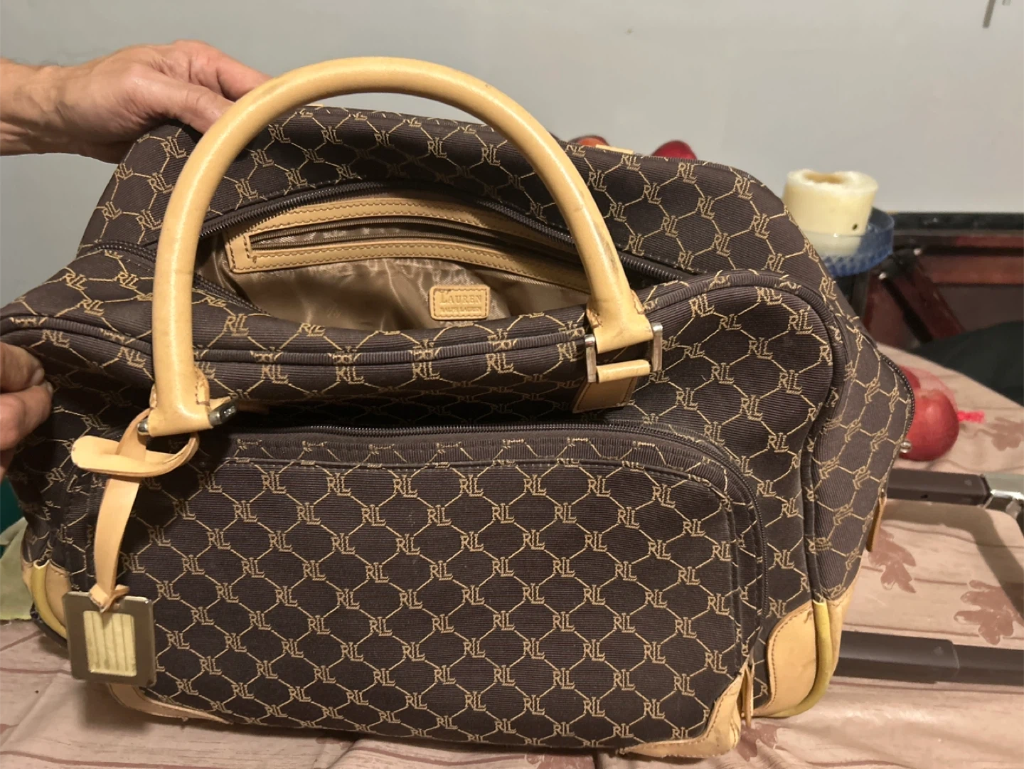 Selling a Ralph Lauren tote bag with a brown patterned design. It features a spacious interior and sturdy handles, perfect for everyday use. The bag shows some signs of wear, but it's still in good condition and ready for a new owner!