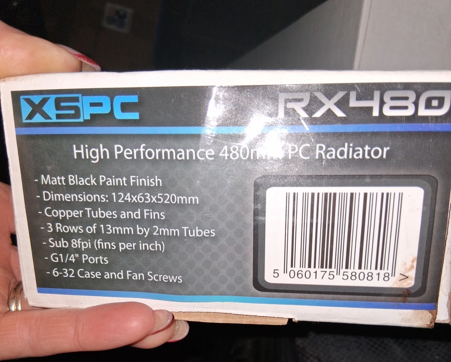 Selling an XSPC RX480 High Performance 480mm PC Radiator. It features a matt black paint finish and has dimensions of 124x63x520mm. It also has copper tubes and fins, 3 rows of 13mm by 2mm tubes, Sub 8fpi (fins per inch), G1/4" Ports, and 6-32 case and fan screws.
