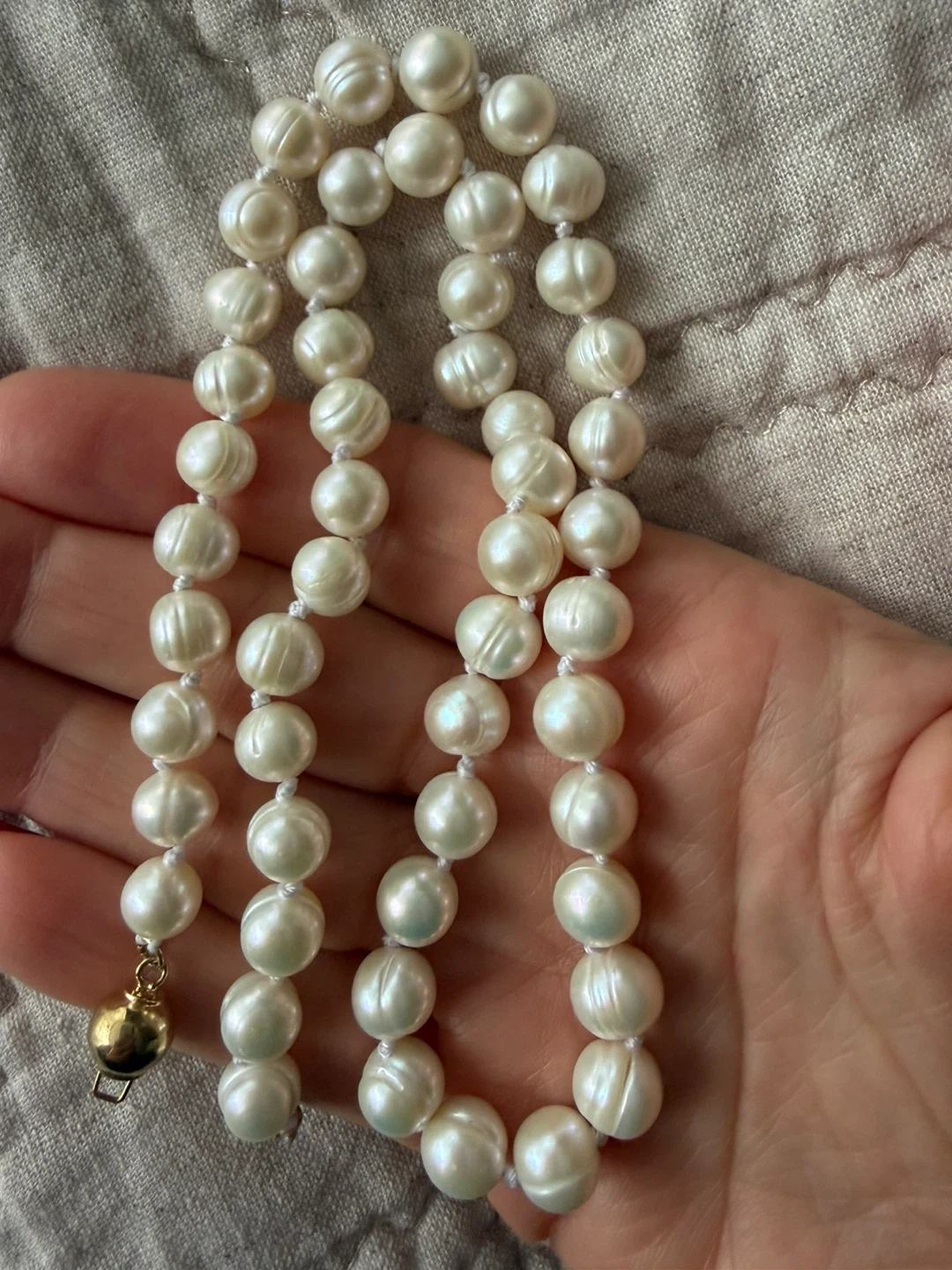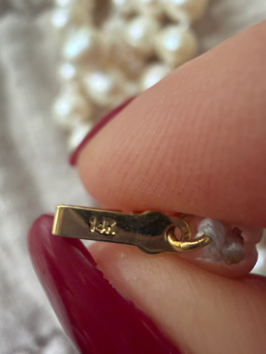 Beautiful pearl necklace with a 14k gold clasp! It's a classic piece that would look great dressed up or down. The pearls have a lovely lustre and are strung on a durable cord. Perfect for adding a touch of elegance to any outfit