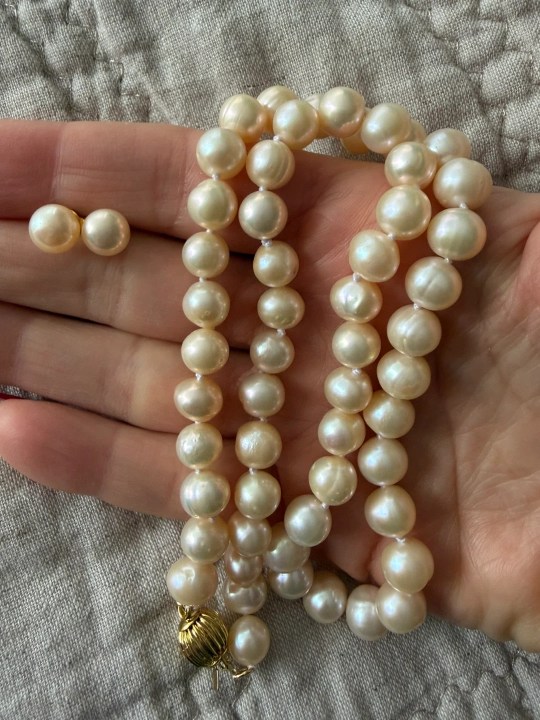 Beautiful pearl necklace and matching earring set! The pearls have a lovely luster and the necklace has a secure gold-tone clasp. Perfect for adding a touch of elegance to any outfit