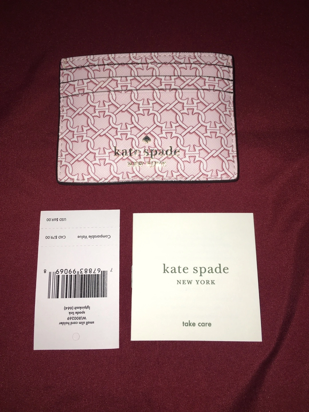 Here’s a cute Kate Spade small slim card holder! It’s a light pink colour with a unique pattern. Originally bought for $79 CAD.