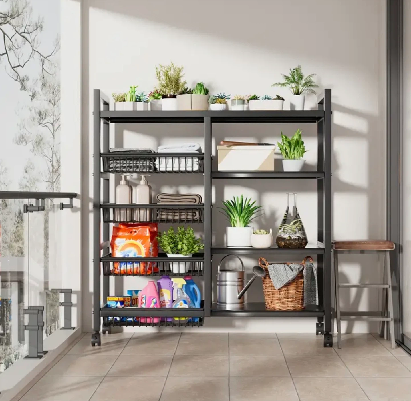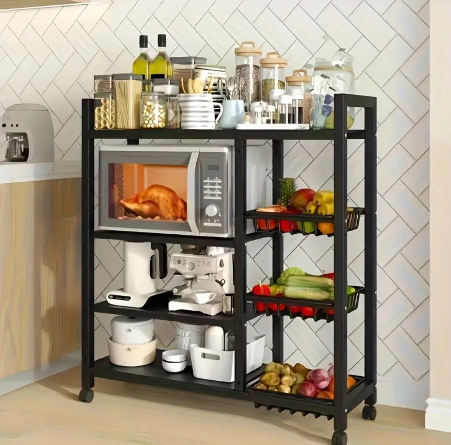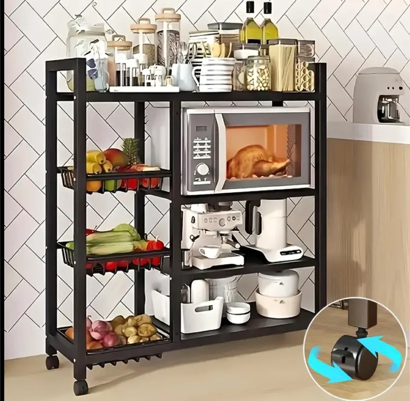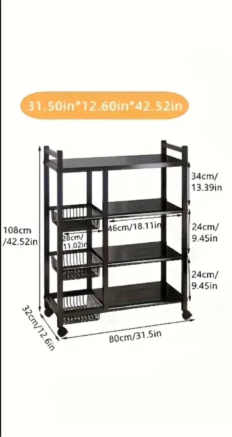 This is a handy black metal rolling storage rack! It's perfect for the kitchen, garage, or anywhere you need some extra shelving. The adjustable floor height and flexible adjustment of required floor height make it super versatile! It also has wheels for easy moving.