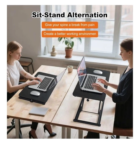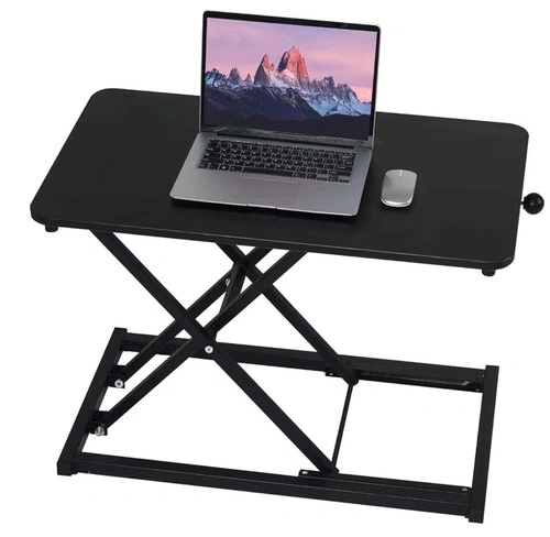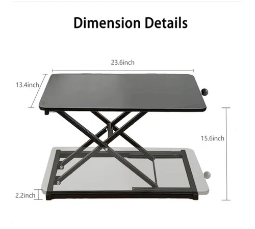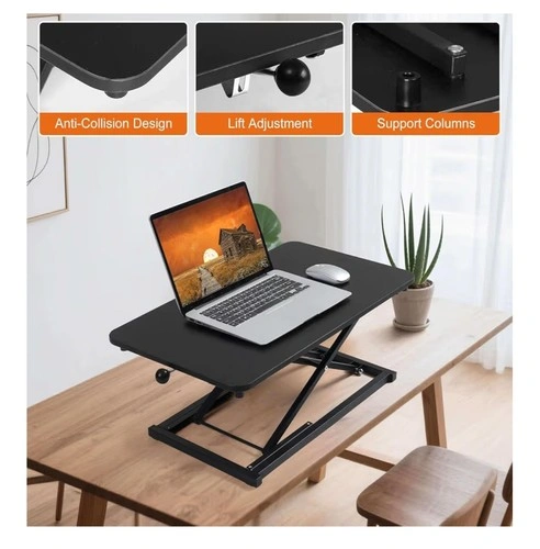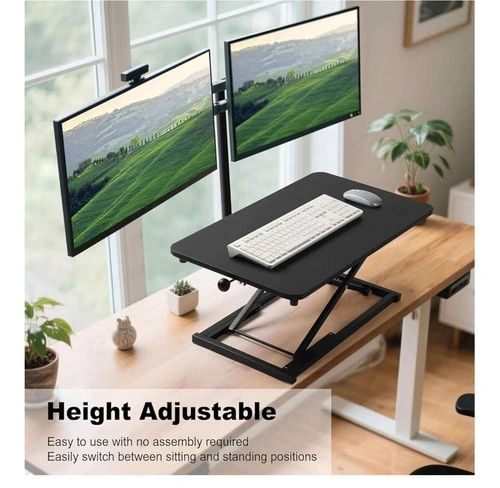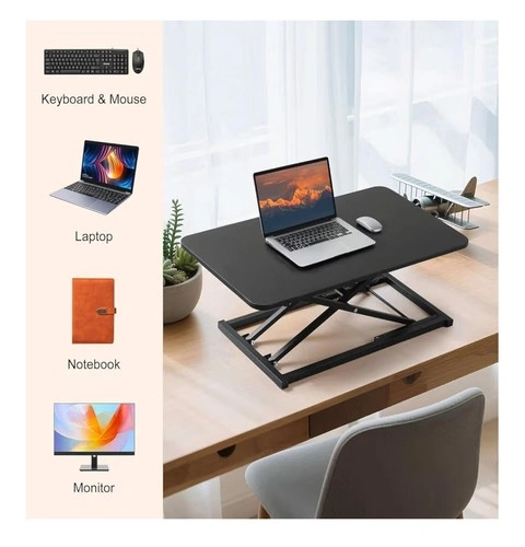 The Standing Desk Converter is a height adjustable desk riser designed for office use. It features a rectangular shape with a black lacquered finish, metal furniture legs, and an adjustable lifting mechanism. The desk converter includes a mobile phone holder and is suitable for adults in an office setting. With a maximum height of 15.7 inches and a minimum height of 3 inches, it offers a convenient sit-to-stand option for improved posture and overall health while working. The minimalist design and easy product care instructions make it a practical choice for enhancing your workspace.