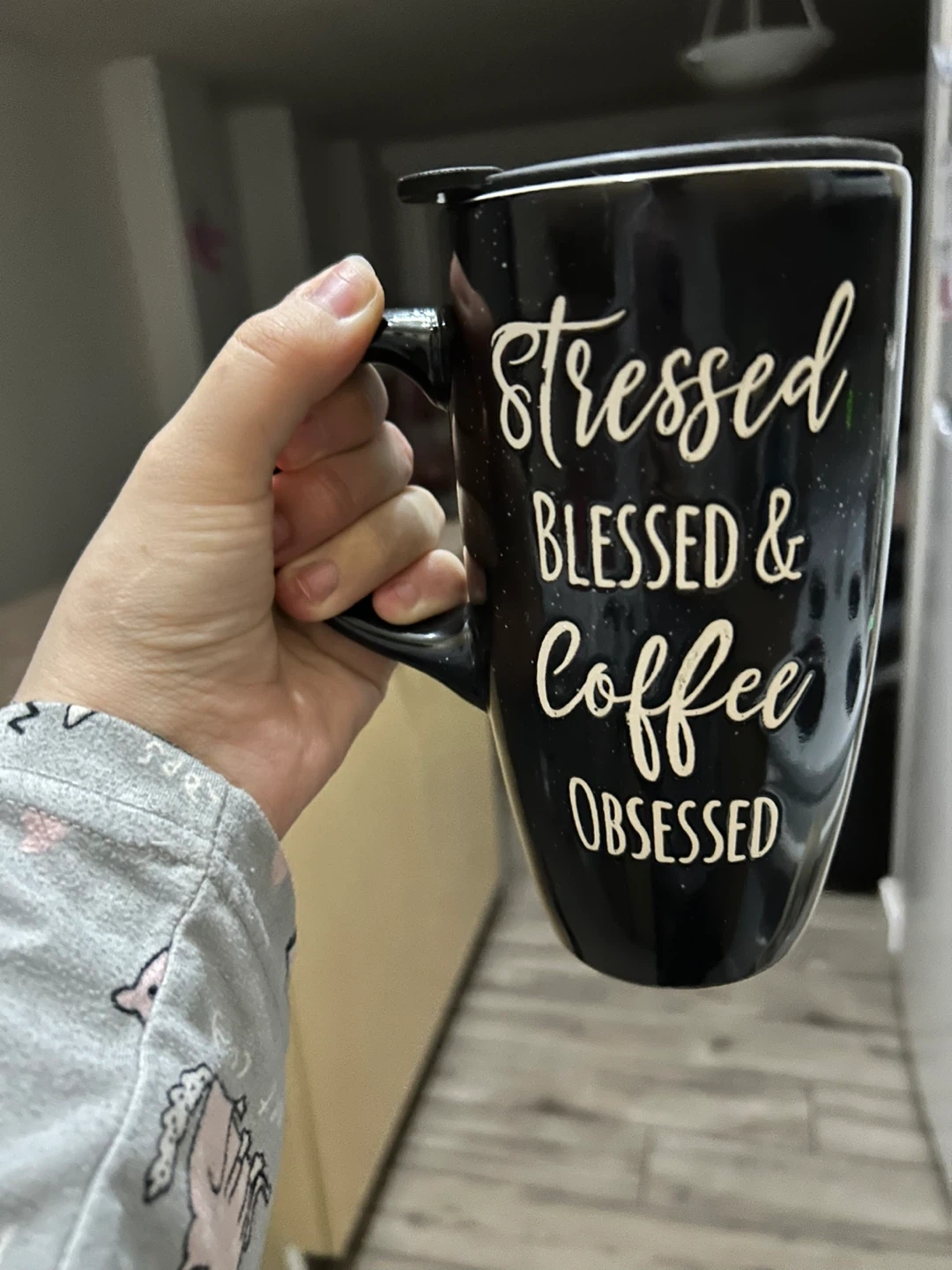 3. Black coffee cup with handle and lid. Says: Stressed, Blessed and Coffee Obsessed!