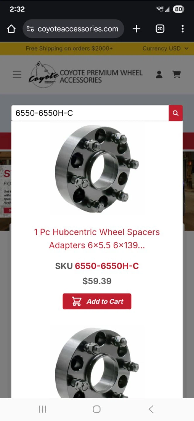 Selling a set of Coyote Premium Wheel Accessories. These are hubcentric wheel spacers/adapters, model 6550-6550H-C, designed for a 6x5.5 (6x139) bolt pattern. They're made from 6061 billet aluminum.